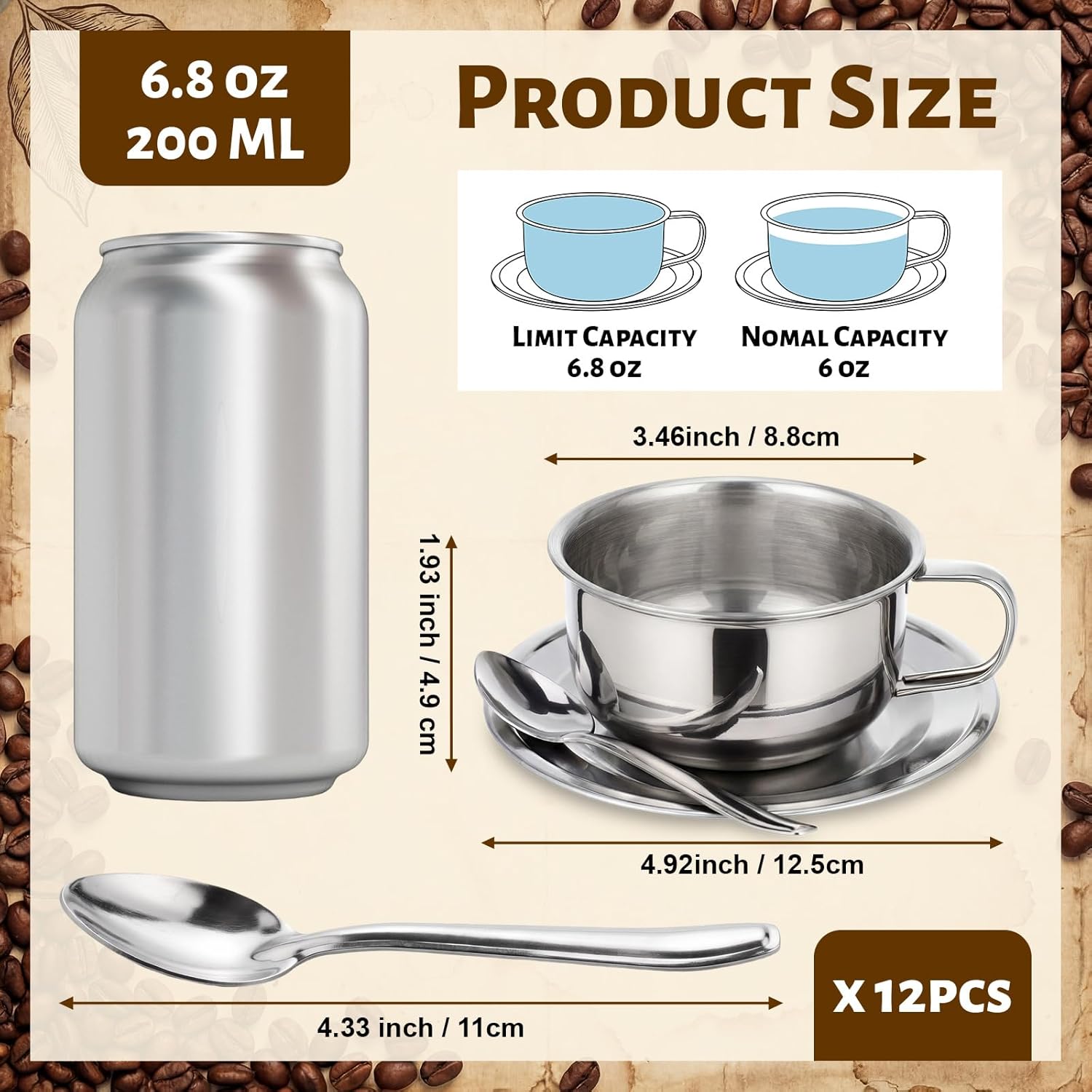 Features: Versatile Cup Set: The stainless steel coffee cup set is ideal for serving latte, espresso, cappuccino, coffee, hot cocoa, tea, milk, etc. Also can be applied as a great gift for coffee and tea lovers. Various Occasions: The elegant coffee cup sets are suitable for cafe, bar, restaurant, office, home, kitchen, dining. Portable design is also ideal for outdoor picnic and camping. Specifications: Material: stainless steel Color: silver Size: Coffee cup: about 3.54 x 1.97 inches Saucer: about 4.92 inches Spoon: about 4.33 inches Package includes: 12 x Coffee cup 12 x Saucer 12 x Spoon Notes: Manual measurement, please allow slight errors on size. The color may exist a slight difference due to different screen displays