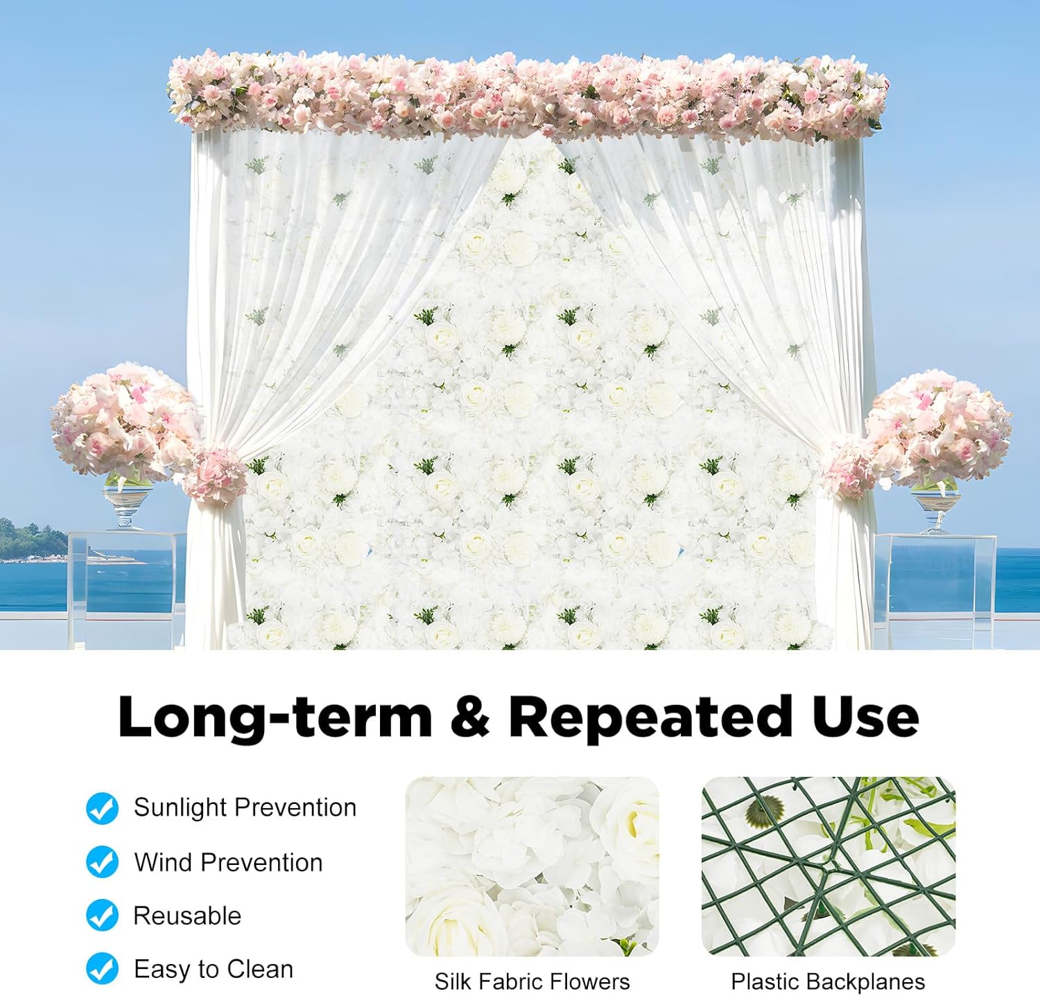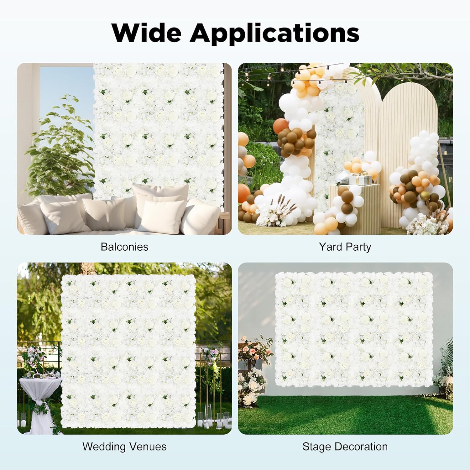 [Description]Are you looking for a beautiful and durable plant wall? This product will attract your attention. The 3D flowers, realistic shapes, and bright colors make you feel like you are in a natural garden, bringing you an immersive experience! [Details]Pinhole Locking: It makes the panels easy to join and allows for very small gaps between the wall panels for a more realistic look. Smooth Flowers: The flowers have been carefully cut without burrs, giving you a comfortable and safer touch.[Application]It can be widely used in wedding sites, photography buildings, clothing stores, home walls, hotels, and other places to decorate the wall. It is suitable for porch, balcony, garage, terrace, garden, backyard, terrace, playground, field party, wedding, etc.[Specification]Material: Plastic, ClothColor: WhiteStyle: ArtificialFlower Type: White Dahlia, Rose, Chrysanthemum, HydrangeaSeasons: AllNumber of Pieces: 12Net Weight: 1.6kg/3.5 lbsGross Weight: 2kg/4.4 lbsEach Product Size: 38*38cm/15*15inBase Plate Size: 30*30cm/11.8*11.8inPackage Size: 35*35*24cm/13.8*13.8*9.4in[Package Included]12*Flower Wall Panels