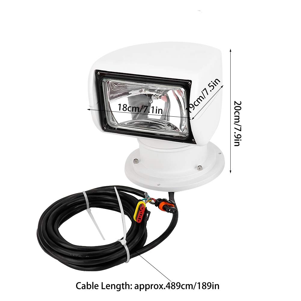 Specification: Condition:Brand New Material: PC+Aluminum Color: As Pictures Shown Voltage: 12V Power: 100W Luminous Flux: 2500LM Color temperature: 3200K Lighting Angle: right left 360°, up down 72° Size: approx.19*18*20cm/7.5*7.1*7.9in Cable Length: approx.489cm/189in Weight: Approx.2628g/92.7oz Package list: 1 * Marine Searchlight(Connecting Remote Controller)