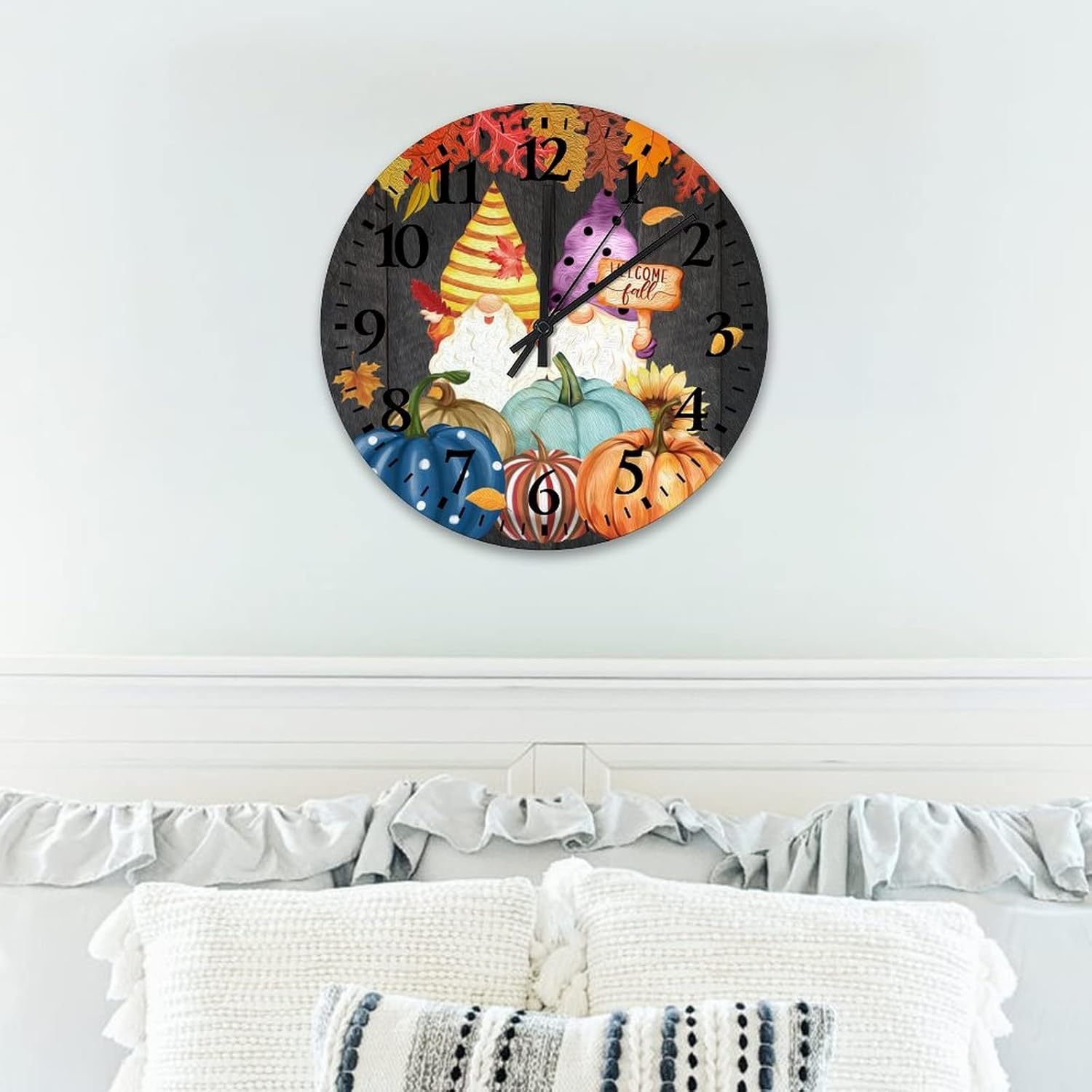 Welcome Fall Gnome Pumpkins Wall Clocks Thanksgiving Autumn Halloween Vintage Wood Print Wall Clock Battery Operated Silent Round Arabic Numbers Clock Bathroom Kitchen Living Room Bedroom 15 Inch??Details:Product Size: 10/12/15 inches, (25/30/38 cm)Shape:RoundMaterial: Wood??Functional Home DécorThis Sunflower Maple Leaves clock aren't just for timekeeping. They function as beautiful wall decor pieces, beyond telling time, and bring both style and purpose to any room.A charming home decoration, very suitable as a housewarming gift, making the home more warm. Suitable for any room, you can put it in any room such as home, living room, master bedroom, kitchen, bathroom, home office, etc. Elegant, durable and stylish.??Clock Hands Troubleshooting Guide:Check that the battery is a new battery and not a used battery.Make sure the hour and minute hands are not crossing or touching each other. If they are, adjust the hands by slightly bending them.See if the center pin that holds the hands together is firmly pushed in or screwed on, depending on the style.If hands are still not moving after the above, please reference the hands replacement instructions included with all of our open face clocks.