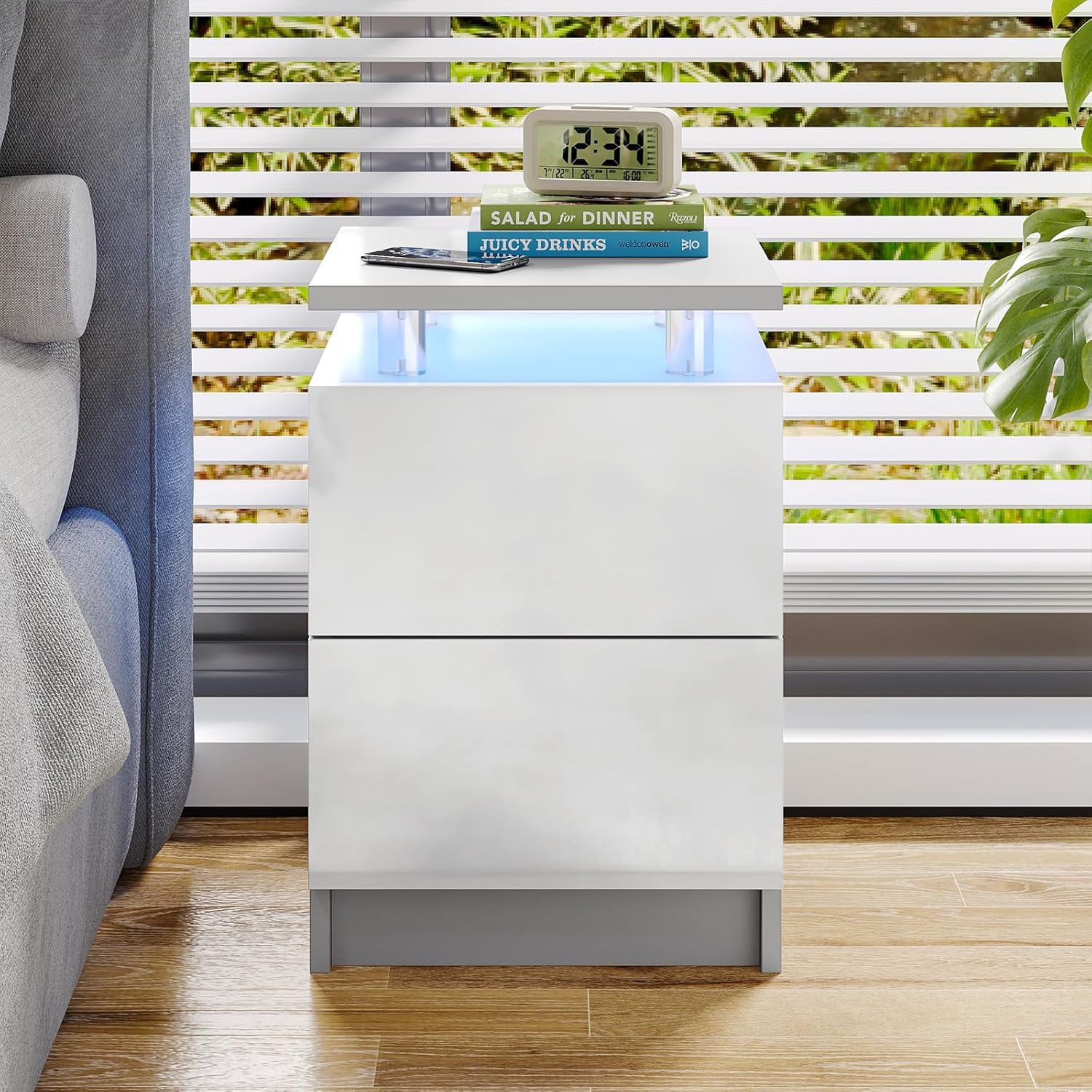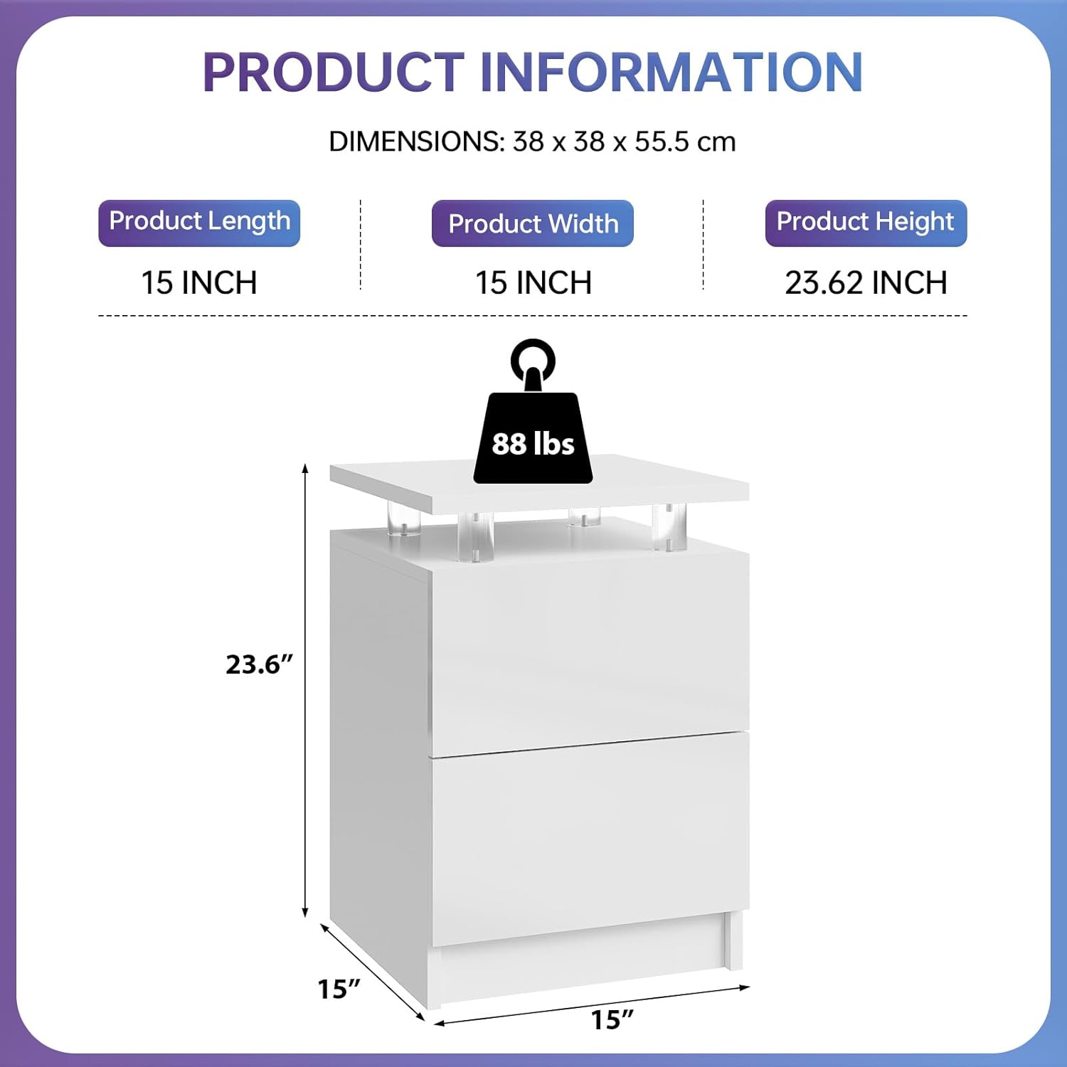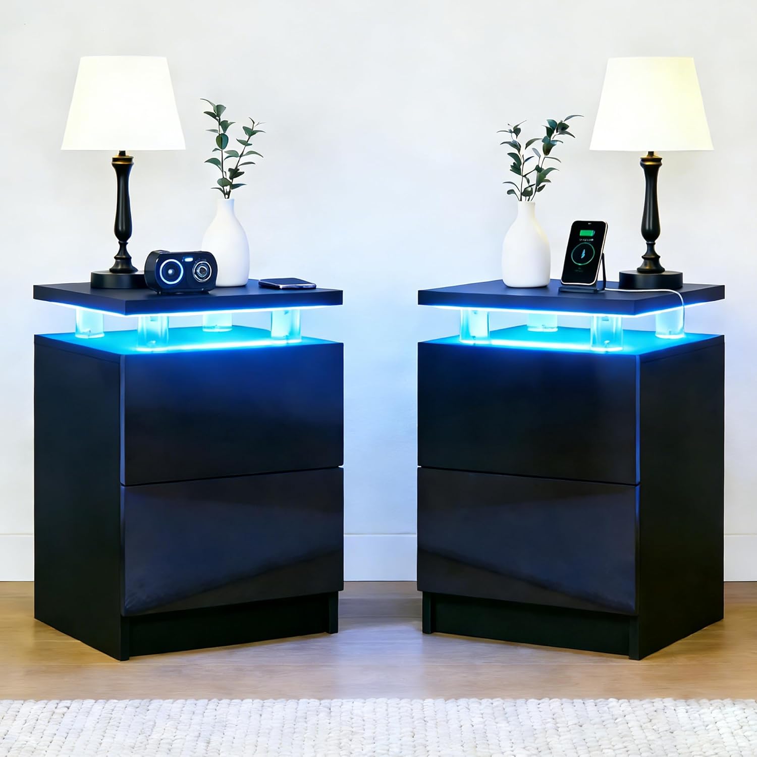 15" Nightstand Set of 2 with LED Light, NightStands with 2 Storage Drawers, Bedside Table for Bedroom,15IN White Bedside Table with Remote Control, Modern White
