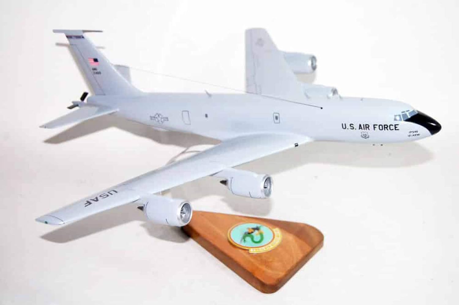 166th Air Refueling Squadron KC-135 ModelFly with the 166th Air Refueling Squadron in this hand crafted KC-135 Model. Each piece is carved from wood and hand painted to provide a piece you'll love. Length - 18 inches.World War IIThe 364th Fighter Squadron was established at Hamilton Field, California in December 1942 and was part of the 357th Fighter Group.Became part of the United States Air Forces in Europe army of occupation in Germany during 1945. Inactivated in Germany during August 1946.Ohio Air National GuardThe wartime 364th Fighter Squadron was re-designated as the 166th Fighter Squadron, and was allotted to the Ohio Air National Guard, on 24 May 1946. It was organized at Lockbourne Army Airfield, Columbus, Ohio, and was extended federal recognition on 10 November 1947 by the National Guard Bureau. The 166th Fighter Squadron was bestowed the lineage, history, honors, and colors of the 364th Fighter Squadron. The squadron was equipped with F-51D Mustangs and was assigned initially to the Illinois ANG 66th Fighter Wing, operationally gained by Continental Air Command. On 7 December 1947 the Ohio ANG 55th Fighter Wing, was federally recognized and the squadron was transferred.With the formation and federal recognition of the Ohio ANG 121st Fighter Group at Lockbourne Field, near Columbus, the squadron was reassigned. The mission of the 166th Fighter Squadron was the air defense of Ohio. Parts were no problem and many of the maintenance personnel were World War II veterans so readiness was quite high and the planes were often much better maintained than their USAF counterparts. In some ways, the postwar Air National Guard was almost like a flying country club and a pilot could often show up at the field, check out an aircraft and go flying. However, the unit also had regular military exercises that kept up proficiency and in gunnery and bombing contests they would often score at least as well or better than active-duty USAF