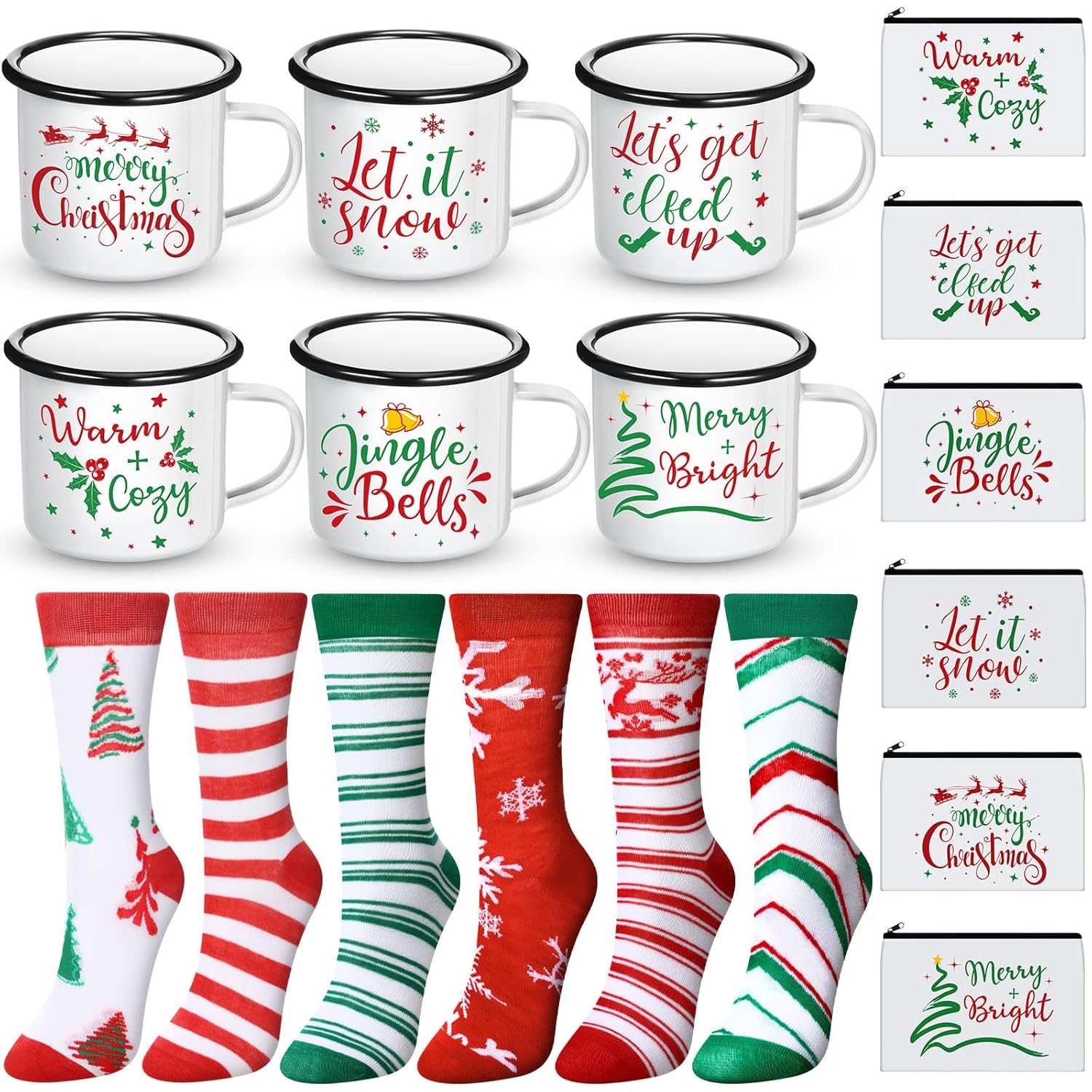 Features: Complete package: This set includes 6 Christmas coffee mugs, 6 Christmas makeup bags, and 6 pairs of Christmas socks in 6 different colors. The quantity is sufficient for multiple gifting occasions, making it a smart and practical choice. Vibrant and attractive colors: The Christmas mugs and makeup bags are mainly designed in white, making them versatile to match with any decor or accessories. The Xmas gifts socks blend an array of playful colors like red, green, white for a touch of fun and vibrancy. Specifications: Material: Christmas enamel mugs: quality steel with enamel coating Christmas makeup bags: polyester Funny Christmas socks: coral fleece Size: Christmas enamel mugs: about 3 x 3.7 inches/ 7.6 x 9.4 cm, and 12 oz Christmas makeup bags: about 9.06 x 5.91 inches/ 23 x 15 cm Main color: Christmas enamel mugs: white Christmas makeup bags: white Funny Christmas socks: red, green, white Package includes: 6 x Christmas enamel mugs 6 x Christmas makeup bags 6 Pairs of funny Christmas socks Notes: Manual measurement, please allow slight errors size. The color may exist a slight difference due to different screen displays