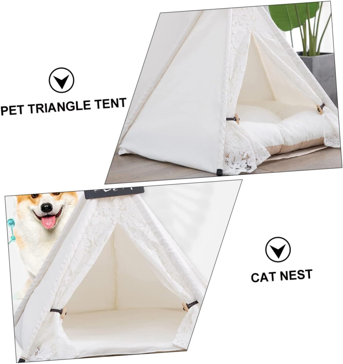 DescriptionThis triangular warm pet bed can create a comfortable environment for pets' and rest. It is super soft and warm, making it the bedroom or resting place for pet dogs or cats.Features-Color: White-Material: Cotton canvas and pinePackage Including1 x Paper Case1 x Tent