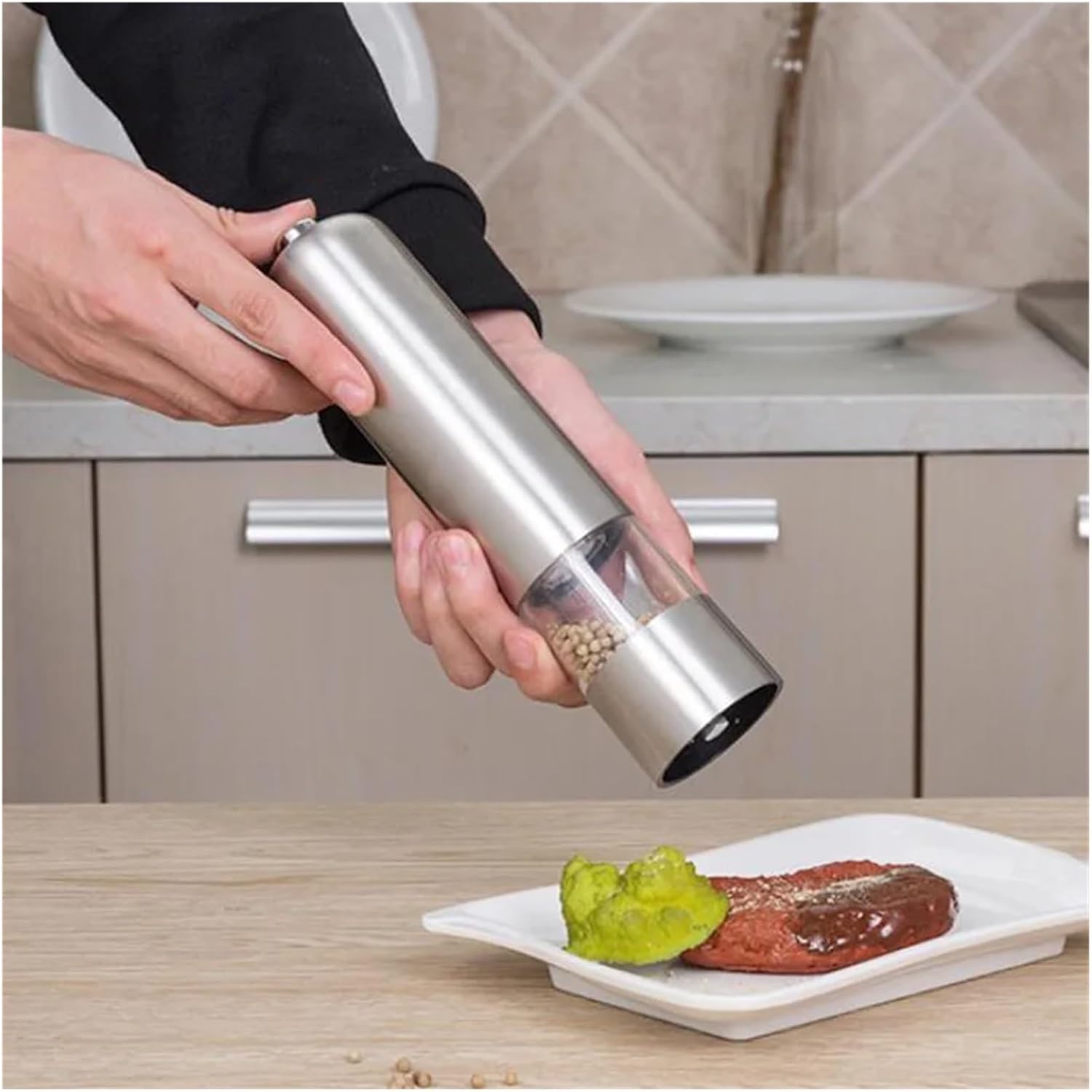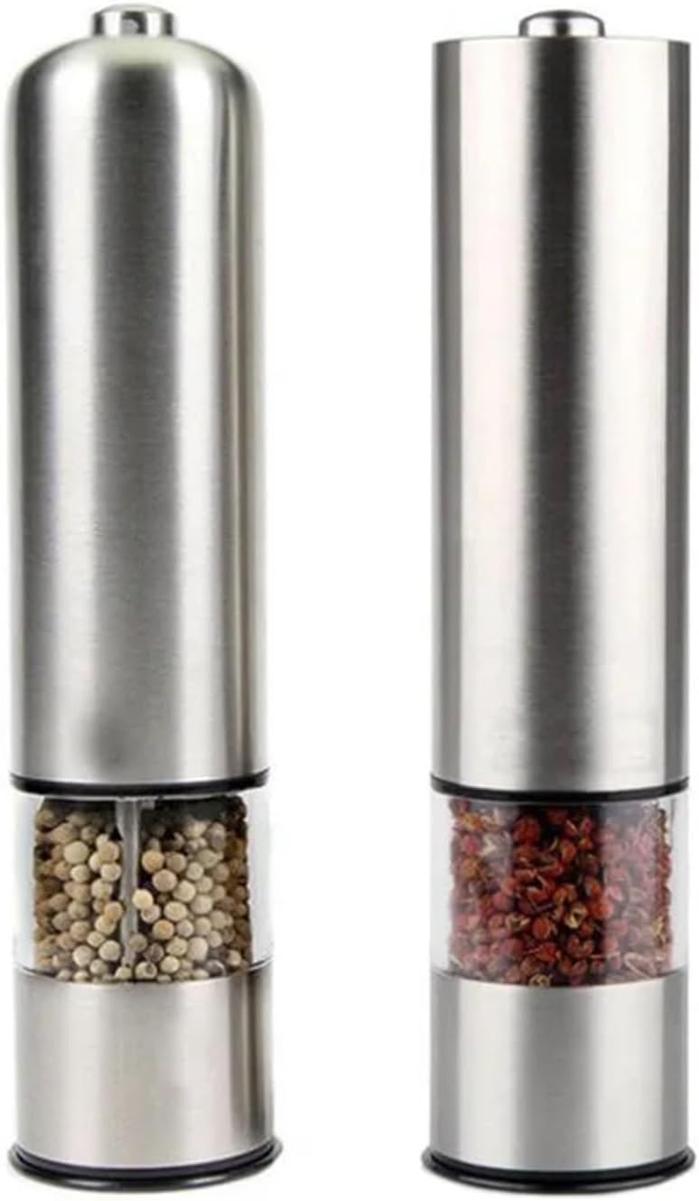 Stainless steel Electric Pepper Mill Salt and Pepper Grinding Adjustable Coarseness Spice Grinder Muller Kitchen Tool4 * AA batteries (not included).Specifications:Color: SilverMaterial: Stainless SteelPower: 4 * AA Batteries (not included)Item Size: 5 * 5 * 22cm / 1.97 * 1.97 * 8.66inItem Weight: 276gPackage includes:1 X Pepper Grinder==========Model Number : WT127Material : MetalMills Type : Salt & Pepper MillsType : MILLSMaterial : Stainless Steel