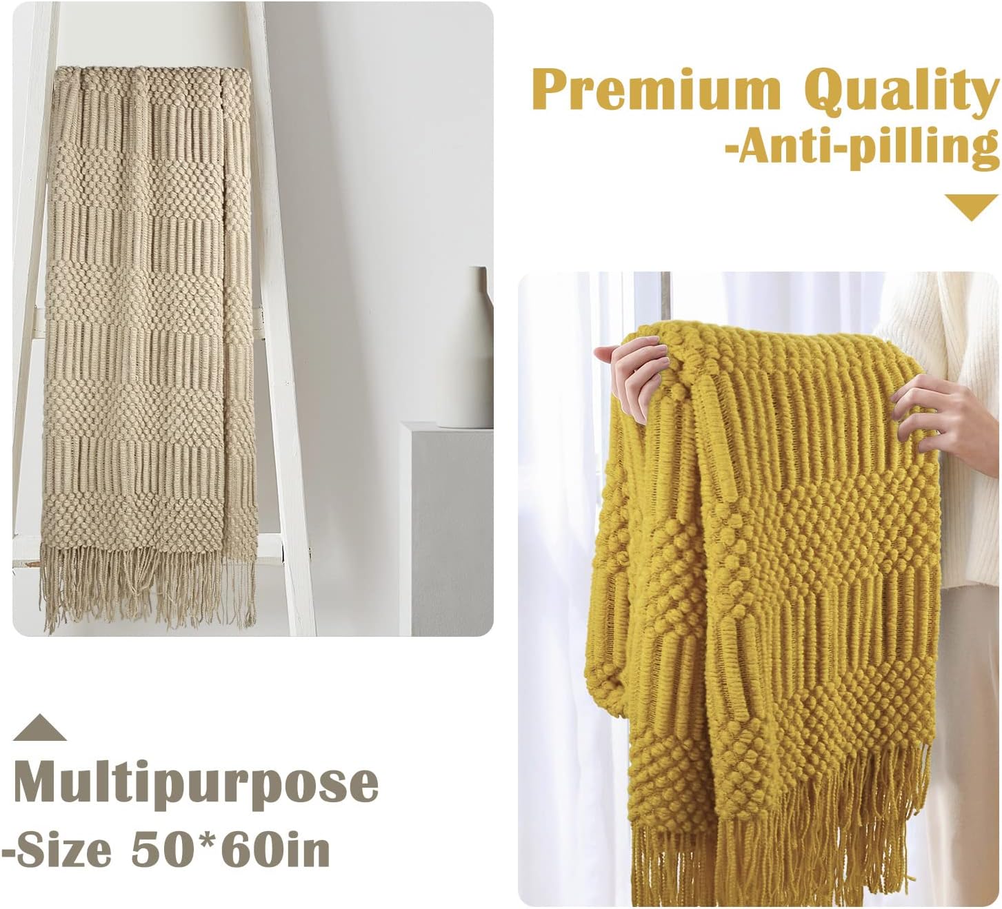 • Knitted Throw Blankets - Include 1 Khaki and 1 Mustard Yellow throw blanket, vivid colors and classic tassels accentuate your space, and it's very chic to throw on sofas, beds, reading nooks
