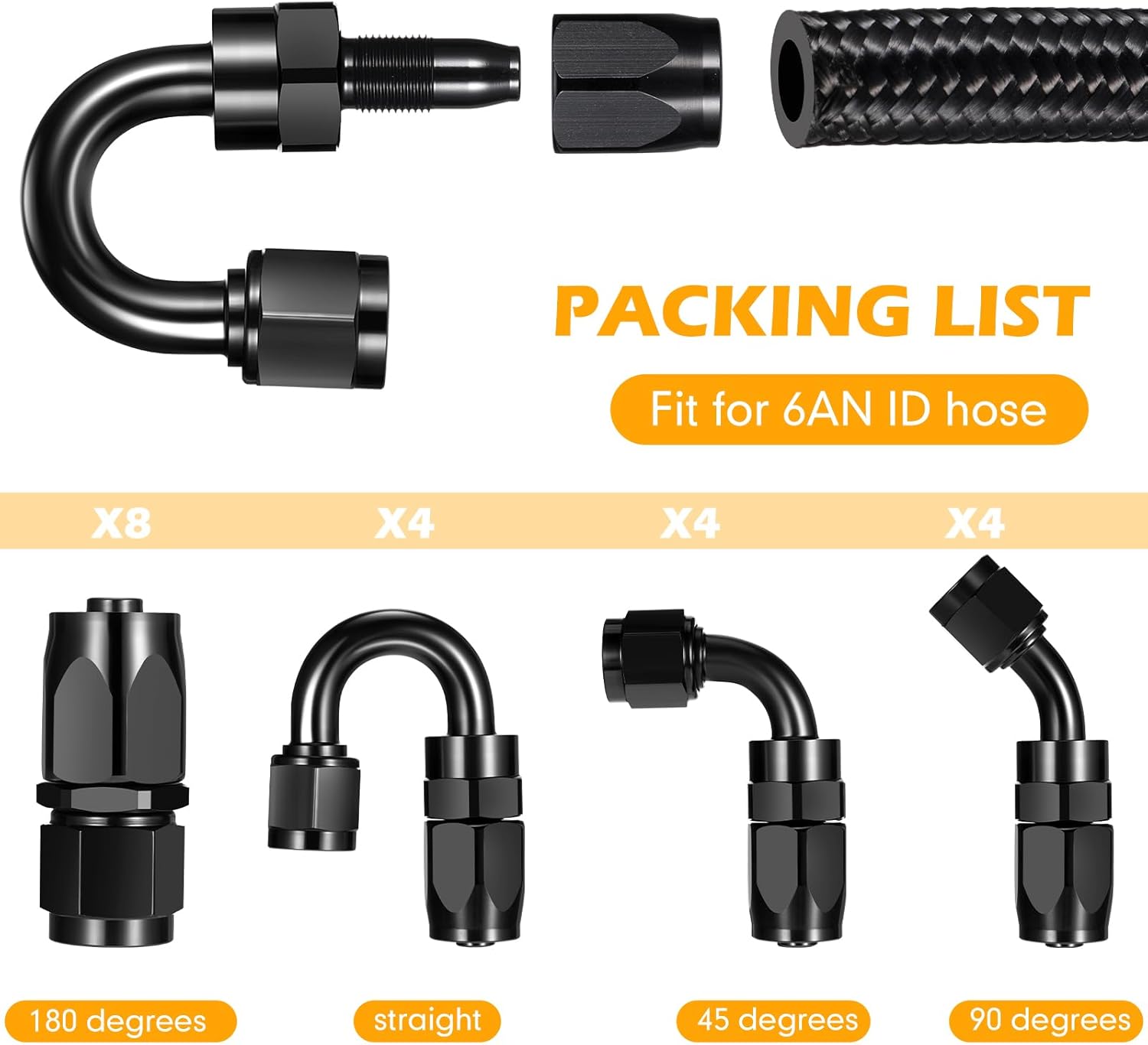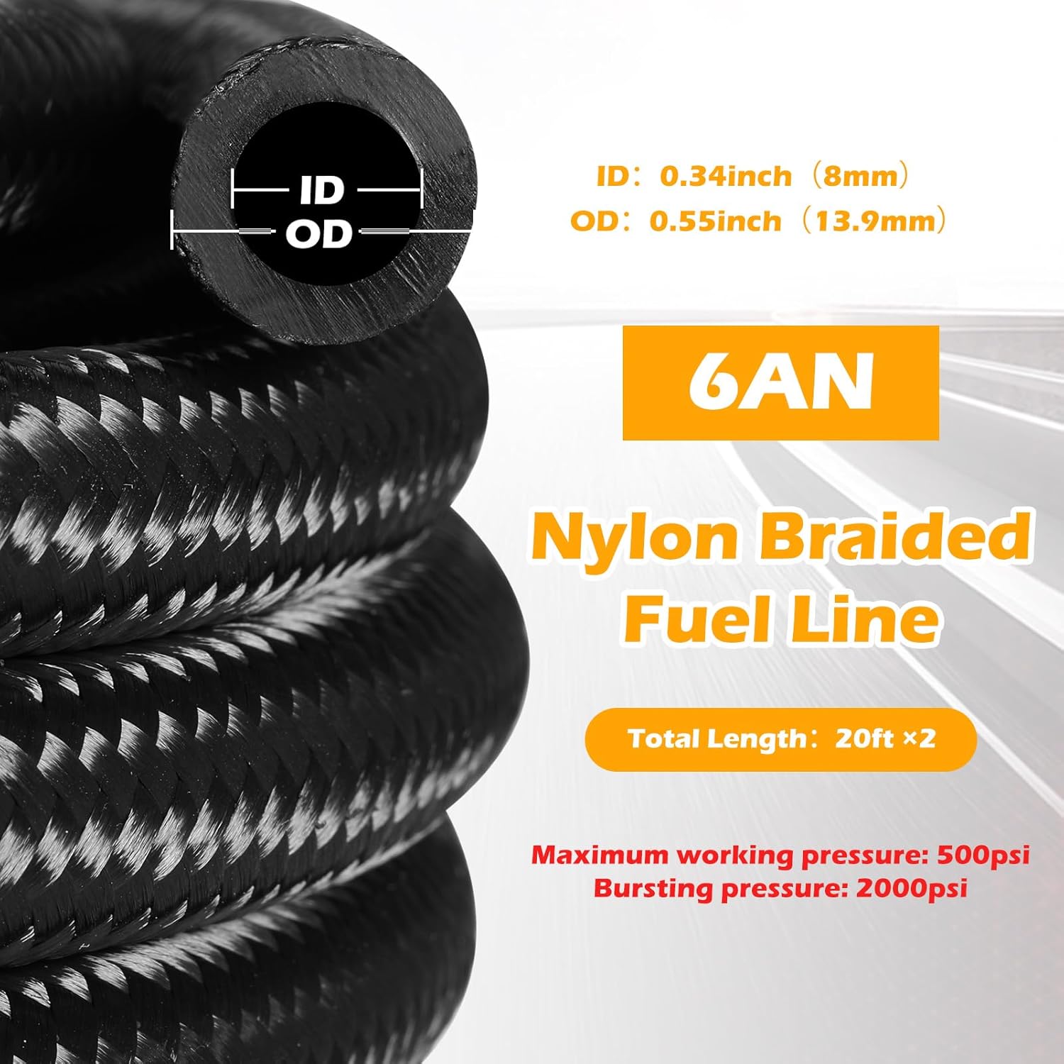 Features: Nylon and stainless steel braided fuel hose kit can be compatible with transmission fluid, oil, race gas, vacuum, hydraulic fluid, and fuel. Nylon Braided + CPE Synthetic Rubber. The fitting made of T6061 Aluminum, high strength and good durability. The material of union adapter is lightweight aluminum. Specifications: Color: black Material: nylon braided + CPE synthetic rubber Quantity: 22 Size: as shown in picture Package includes: 2 X 20 ft braided fuel lines 20 X 6an hose ends (8pcs straight, 4pcs 45 degrees, 4pcs 90 degrees, 4pcs 180 degrees) Warm notes: Please allow slight size error due to manual measurement. The colors may exist slight difference due to different screen. Winding risk may exist, please keep our product away from children.