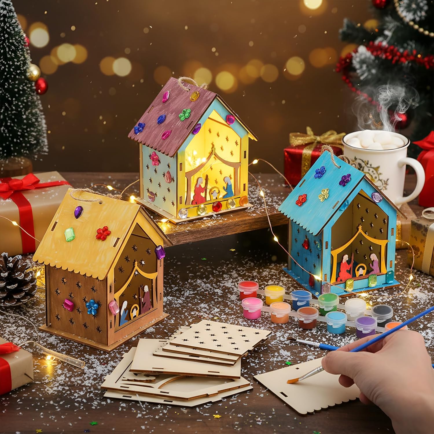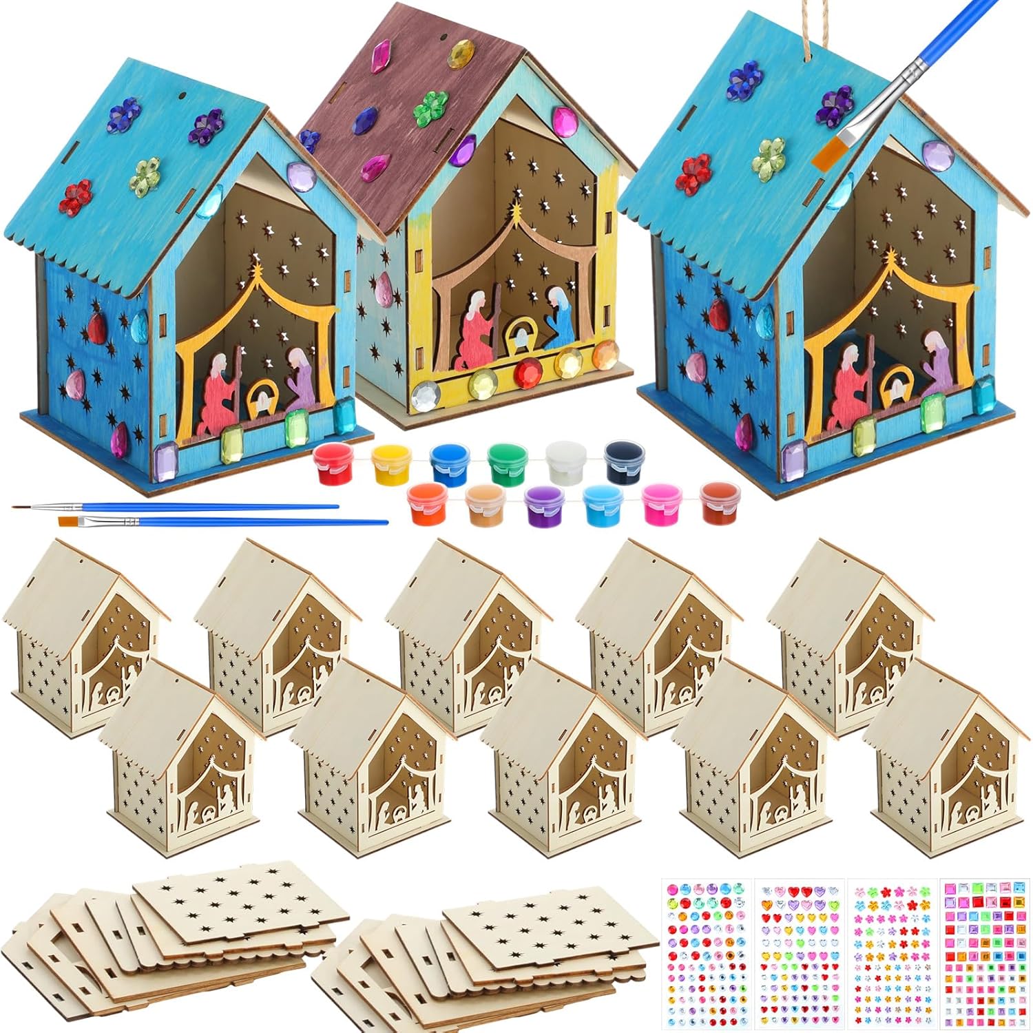 Features: Natural Wood Elegance Crafted from natural wood, this nativity craft kit offers a serene and timeless appearance, perfect for those who appreciate simplicity and elegance. The wood houses for Christmas retain their natural color, making them an ideal canvas for creative expression. Whether you're looking to add a personal touch or keep them rustic, these kits seamlessly blend tradition with creativity. Reusable Holiday Tradition: Durable wooden design lasts for years—unlike disposable decor, A sustainable way to celebrate Christmas annually! Specifications: Material: wooden Color: natural wood color Size: 10×9×13cm/3.94 x 3.54 x 5.12 inches Package includes: 12 × nativity craft kit 4 × paints 2 × Paint Brush 1 × acrylic rhinestones 12 × nativity craft kit Notes: Manual measurement, please allow slight errors on size. The color may exist a slight difference due to different screen displays