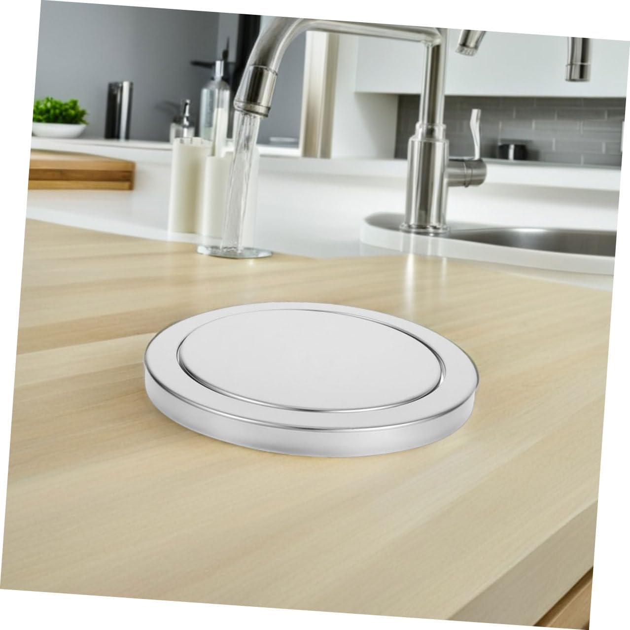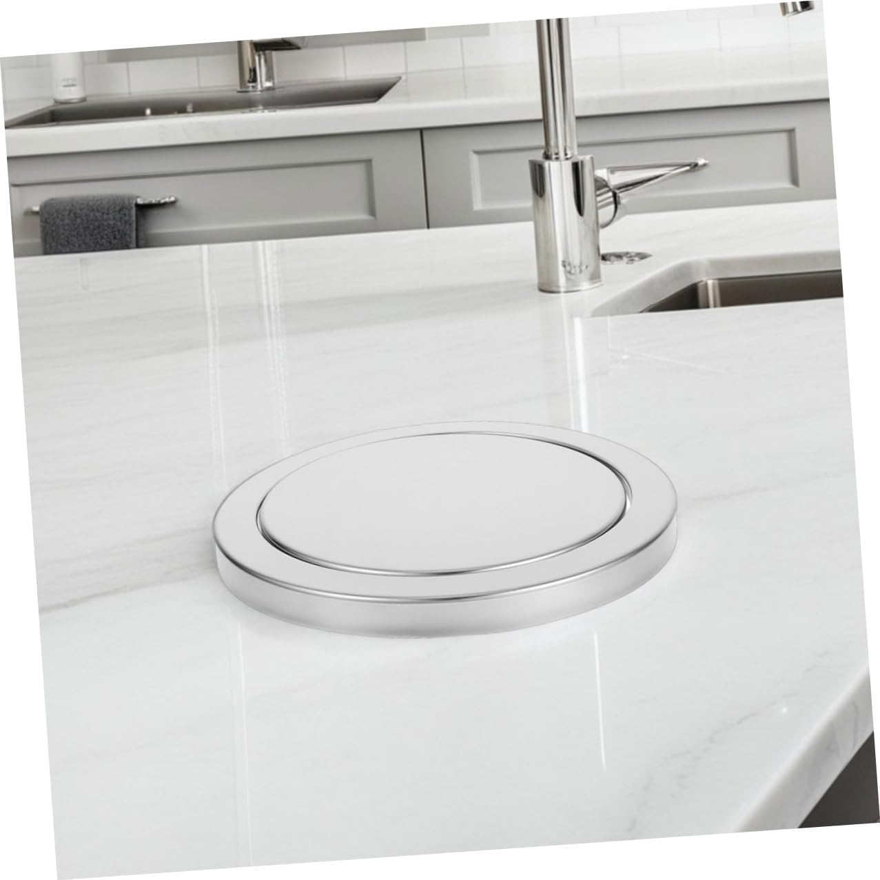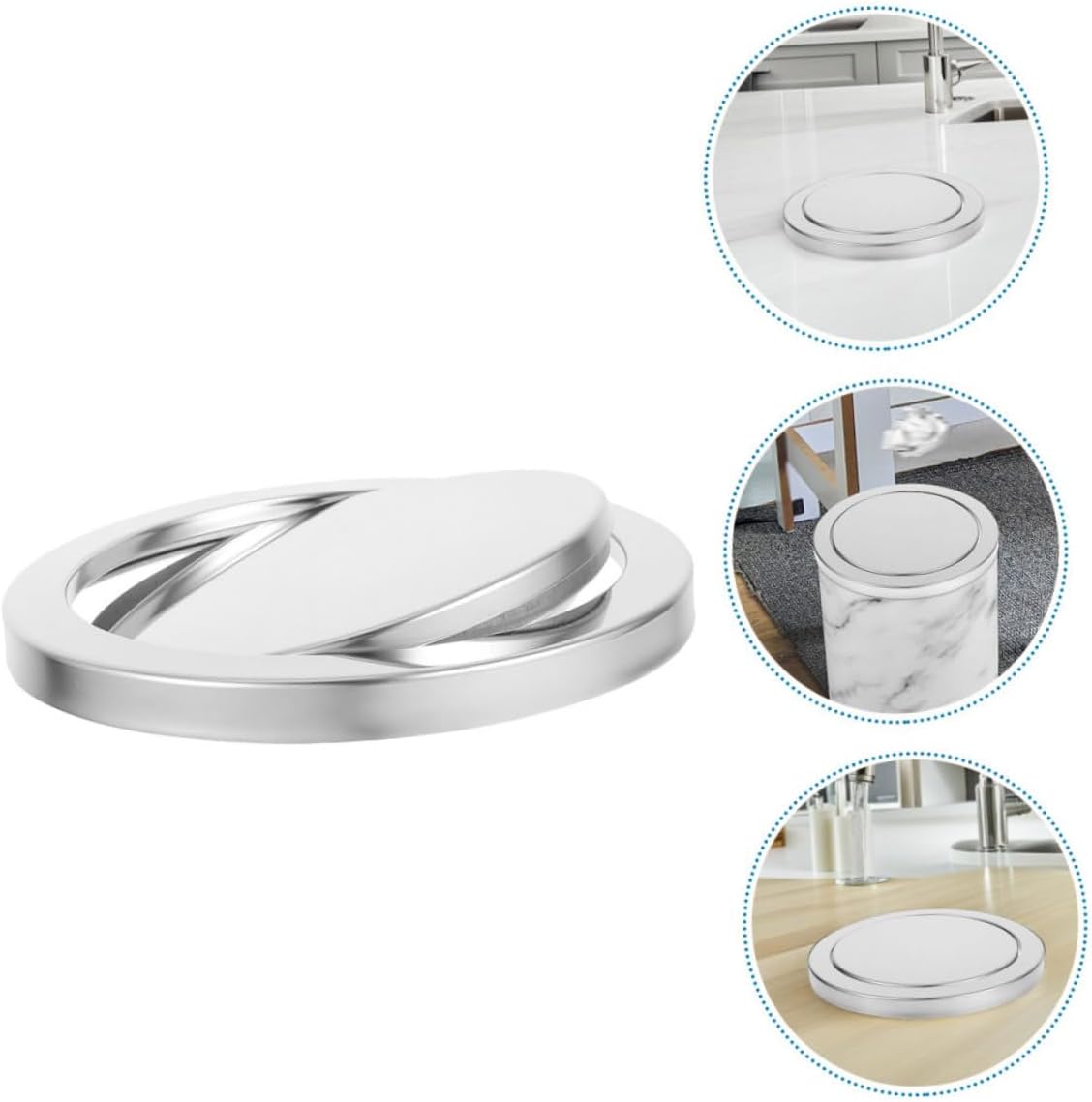 Package List 2 x embedded trash can lid Characteristics -Color:Silver -Sophisticated style: concealed design integrates seamlessly into any countertop, enhancing the overall aesthetic appeal swing trash cap -Size:19.70X19.70X3.40cm/7.74X7.74X1.34in(Lid diameter) -Space-saving solution: embedded countertop design frees up floor space, ideal for small kitchens, bathrooms, and hotel rooms drop-in countertop trash chute -Fresh environment: the swing-top lid design helps contain waste smell, a fresher and more inviting indoor space countertop trash can cover -Size:24.80X24.80X3.40cm/9.75X9.75X1.34in(External diameter) -Material:Stainless steel -Universal compatibility: adjustable to fit most openings, ensuring a convenient installation process countertop waste bin lid -excellent material: stainless steel construction offers high durability, easy maintenance, and a polished finish for a great look -Product Info: Embedded trash can lidGoods Descriptionswinging trash lid for tabletop The stainless steel material ensures durability and easy cleaning, making it suitable for high-traffic areas such as kitchens, washrooms, and hospitality spaces, while maintaining a polished appearance.stainless steel trash grommet Designed for convenience, this countertop trash chute lid allows for waste disposal without compromising style