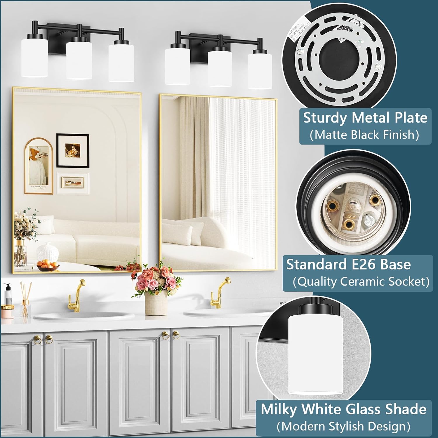 | Included Components | 1 x Black Bathroom Light Fixture, 1 x User Manual for Installation, 3 x Milky White Glass Lampshades |