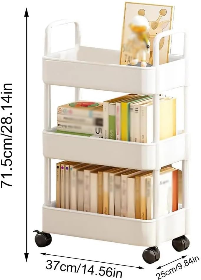 Spacious Design: The storage rolling cart is designed with large capacity shelves making it easy to keep multiple items organized. It's for books, magazines, snacks, and more. With its 3-4 layers and shelves, you can store and easily access your items.Durability Guaranteed: Fitted with spacious drawers and built with materials, this Rolling Utility Cart boasts great strength and durability. Its wear-resistant, PP construction keeps it stable and strong even under heavy use.Well-made Products: Our Rolling Cart Organizer boasts of excellent craftsmanship and no burrs, making it an choice for long-term use. It is fade-resistant and not easy to break, coupled with a smooth appearance that won't scratch your items.Easy Installation: Improve your home organization with our easy-to-assemble Storage Cart. Its universal pulley and 360 rotatable wheels allow for effortless mobility, saving you time and effort while taking up minimal floor space.Diverse Applications: Elevate your storage game with this rolling cart. It can easily fit in bedrooms, living rooms, kitchens, and more. With a design that blends seamlessly with any home decor, it is a practical and beautiful gift for friends, family, or colleagues.Organize your home or office with our Storage Cart on Wheels! With easy access to items, this cart is made with high-strength materials that are not easy to break. Assembling is a breeze. Specifications:Size; (approx.)37*25*71.5cm/14.57*9.84*28.15 Material; ppWeight; 850gPackage: 1*Rolling Book Cart4*hooks (Does not include other demo goods)1. Due to light and screen differences, the color may be slightly different from the picture.2. Due to manual measurement, please allow 1-3 cm difference.3. Thank you for your understanding.assembly—just follow the instructions.