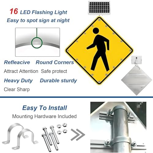 Enhance safety and visibility with our LED Pedestrian Crossing Warning Sign, meticulously designed for optimal performance in various traffic environments. This energy-efficient sign features 16 high-power white LEDs, ensuring pedestrians can be seen from a distance of up to 0.5 miles. Its durable construction, combined with an IP65 protection rating, means it can withstand direct sunlight, rain, and snow, making it a reliable choice for both urban and rural settings. Installation is straightforward with our customizable U-shape hoop mount, compatible with standard column diameters of 76mm and 89mm. The solar charging panel guarantees dependable energy supply, even in remote areas or bustling city streets, providing up to 5 days of illumination on rainy days when fully charged. Key features include: - Bright LED luminance of over 6000mcd for enhanced visibility - Long-lasting LED lifespan of 10,000 hours, reducing maintenance needs - Customizable flicker frequency between 40-60/min to suit your preference Ideal for schools, parks, and busy intersections, this sign not only improves pedestrian safety but also integrates seamlessly into your traffic management system. To ensure optimal performance, install the sign in a location free from shade, and verify LED functionality before final installation. The solar panel should be positioned to receive maximum sunlight throughout the day for effective charging. Upgrade your safety measures with our LED Pedestrian Crossing Warning Sign, a perfect blend of durability, efficiency, and user-friendly design, tailored to meet your traffic safety needs.