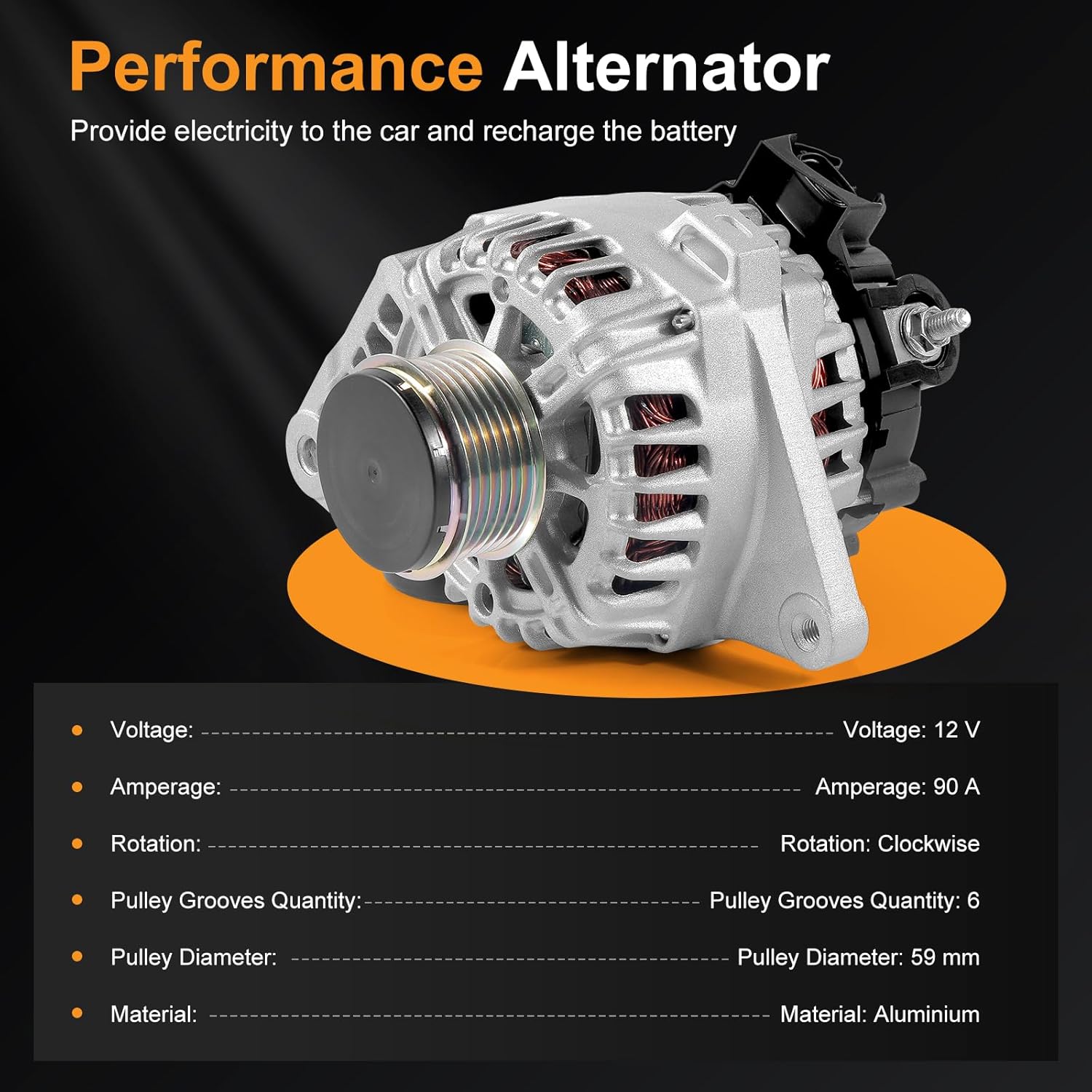 | Model | Aluminum 90A 12V 6 Rib Pulley Alternator 11610 |
