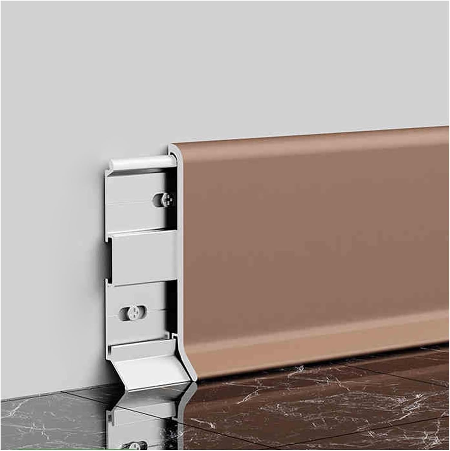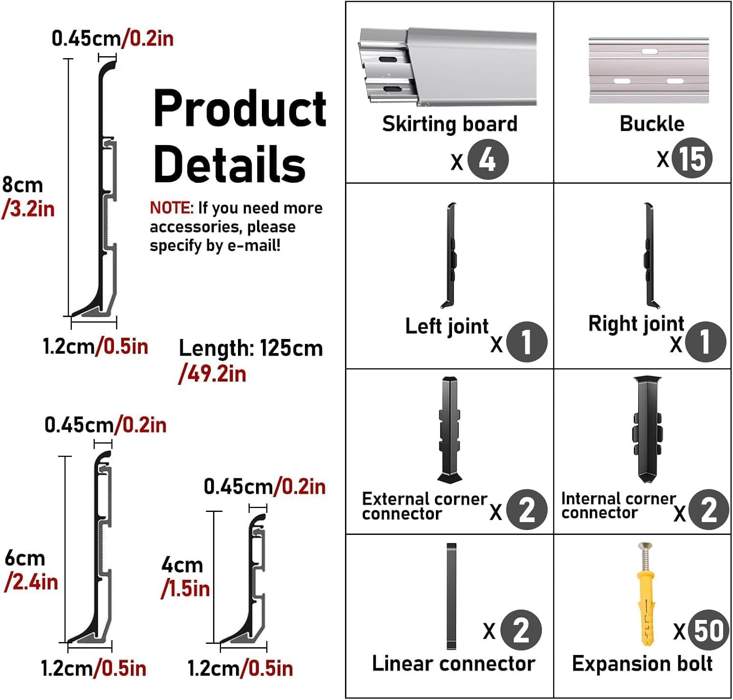 Specification:Material: AluminumLength: 125cm/49.2inWidths: 8cm/3.2in, 6cm/2.4in, 4cm/1.5inPackage Content:4 x Skirting board15 x Buckle1 x Left joint1 x Right joint2 x External corner connector2 x Internal corner connector2 x Linear connector50 x Expansion boltSpecificities:1. It only takes a little soap and water to wipe any stains off of it2. Aluminum alloy base mounting, more environmentally friendly and safer than gluing3. Aluminum is thick and sturdy and cuts easily with a circular saw with a metal cut blade4. Our skirting boards have two tiers of wire routing grooves that can hide and accommodate up to wires and cables, making your home look tidier and more aesthetically pleasingTips:Manual measurement, there will be 1-3cm error, please understand.If a slight odor is normal, it will disappear within two to three days.Due to light and personal differences in color understanding, there will be small color difference,in kind prevail.