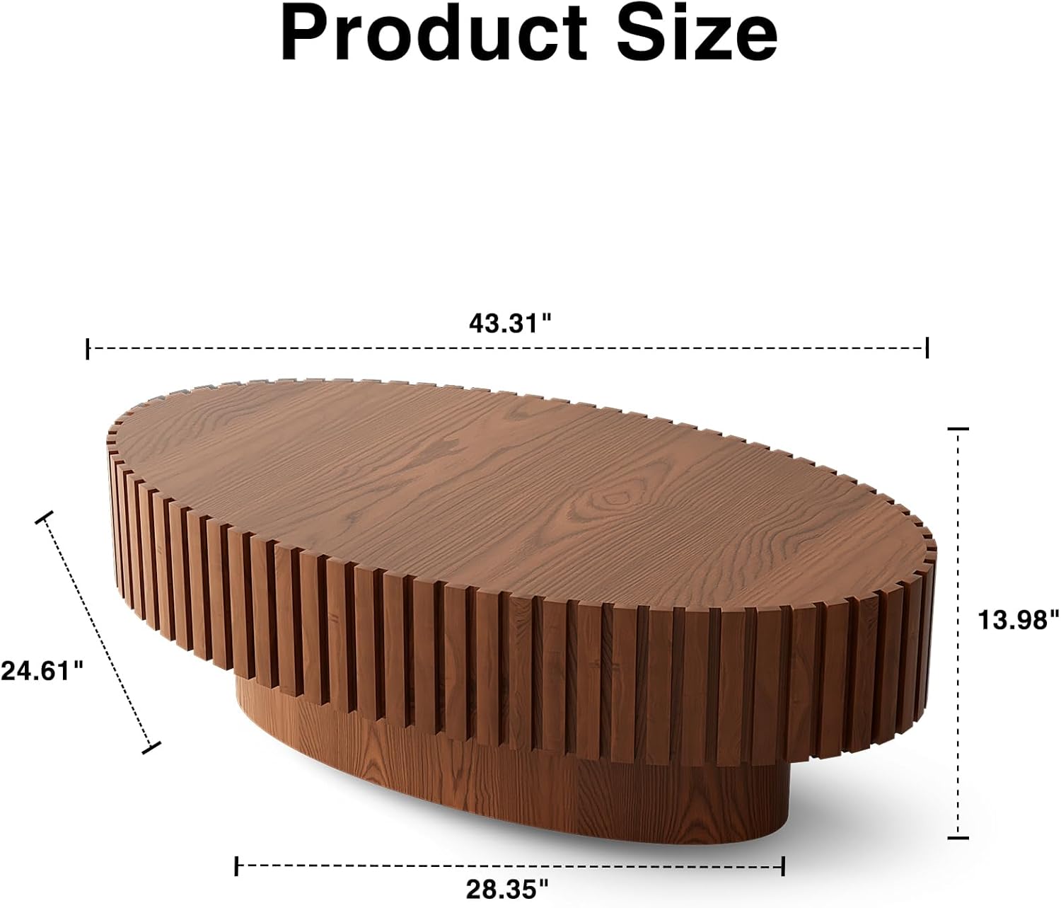 43.31" Oval Coffee Table, Wooden Coffee Table with Handcrafted Relief Sturdy Pedestal, Luxury Fluted Drum Center Cocktail Tea Table, Mid Century Modern Coffee Table for Living Room Office Apartment
