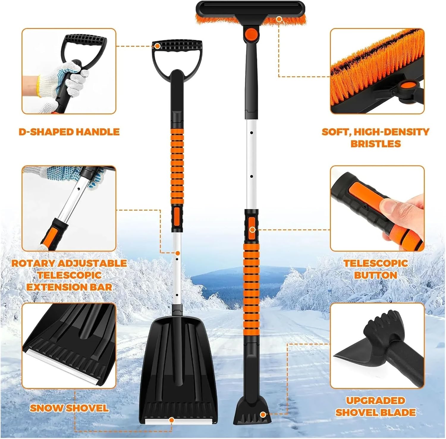 Highlight description:5 in 1 Multi Functional Design : Includes snow brush , ice scraper , windshield wiper , snow shovel and retractable handle . Quickly and efficiently clears snow and ice from cars . Easy to assemble and disassemble for convenient storageEfficient Ice Scraper : The scraper head features an upgraded biting design to easily break thick ice . The flat head clears residual ice without damaging car glass or paint , suitable for thick ice and thin frostRetractable Aluminum Pole : 3 section aluminum pole extends from 31 inches to 40 inches , providing extra length to clear snow from windshields , roofs and truck tops . Compatible with vehicles of various sizes180° Rotating Brush Head : The brush head can rotate 180° , allowing you to easily adjust the angle for optimal snow removal . Soft bristles car paint , and the adjustable lock lets you change between horizontal , vertical or diagonal positionsComfortable Foam Handle Snow Shovel : Quickly converts to a snow shovel for clearing snow around the car . Thick foam handle keeps hands warm and dry , providing comfort even during long term use in cold weatherDetailed description:Product Name: Snow Shovel and Ice ScraperMaterial: Brush Rod: Iron PipeBrush bristles: PVCSnow shovel: PP plasticSize:Storage bag: 45 x 35 cm (17.72 x 13.78 inches)Snow brush: 25 x 9 cm/9.84 x 3.54 inchWith a retractable length of approximately 100 cm/39.37 inchSnow shovel: 21 x 14 cm/8.27 x 5.51 inchWith a telescopic length of approximately 80 cm/31.50 inchParts List:1 x Snow Brush1 x Ice Shovel1 x Windshield Wiper1 x Snow Shovel1 x Extendable Handle1 x Gloves1 x Storage BagNote:1.There may be slight differences between the picture and the actual color of the commodity. We will try our best to show you the exact color.2.Please allow slight dimension difference due to manual measurement.Item Type : ICE SCRAPER