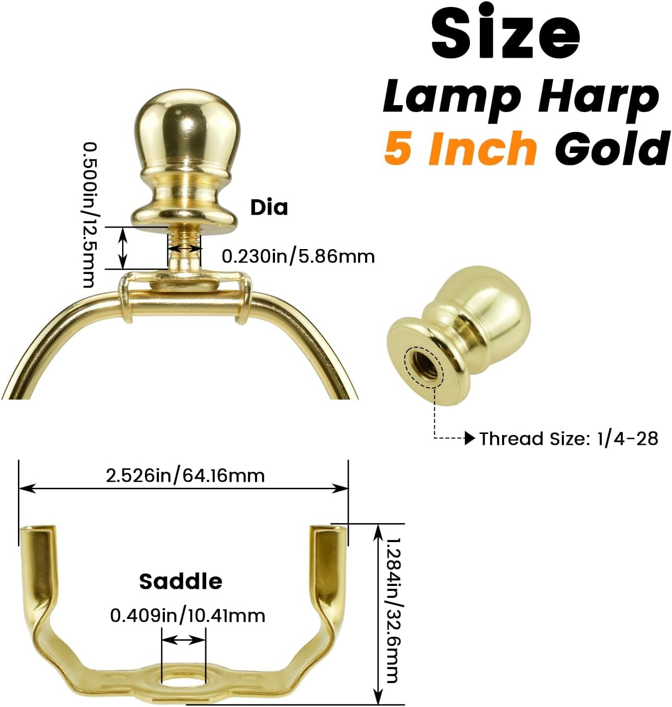 5 Inch Lamp Shade Harp Holder Set, inclues light base and lamp finial.Perfect for your DIY table and floor lamp projects:Lamp harp fitter can secure the lamp shade to standard table or floor lamps, and protect the bulb. Ideal lighting accessories for modern lighting fixtures and contemporary home decoration style.Easily remove and replace accessories:The saddle base and ball lamp finial can be removed, if wishing to keep your existing parts. At the same time, they are also excellent components for repairing old and broken lighting.Heavy duty harp frame and long service time:Made of high quality metal material, with brass plated coating, to ensure rust and corrosion resistant, sturdy and durable.Note:Please check your lamp size before purchase.Specification:Color: GoldMaterial: IronLamp Harp Height: 5 inchSaddle Hole Diameter: 10 mm / 0.4 inchBall Finial Size: 1.02 x 0.79 inches (H x Dia)Package Content:2pcs Lampshade Harp Holders2pcs Lamp Finials2pcs Saddle Bases