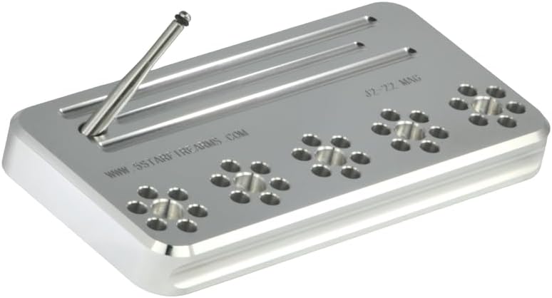Revolutionize your range experience with the J2-22 Mag Range Stand – the perfect solution for swift reloads while keeping your firearm elevated. Featuring 5 spots of 6 rounds each, this innovative kit empowers you with a total of 30 shots before the need to reload. What's more, it comes equipped with a removable stainless steel rod set at an optimal angle to securely cradle your firearm. This kit includes 1 J2-22 Mag Range Stand and 2 J2-22 Mag speedloaders. The J2-22 Mag speedloader is designed to instantly load all cartridges into your revolver at once. Crafted from high-quality aluminum, this speedloader not only ensures durability but also adds a touch of sophistication to your gear. Its precision machining guarantees it's compatible with Ruger (LCR) and Charter Arms (Pathfinder).