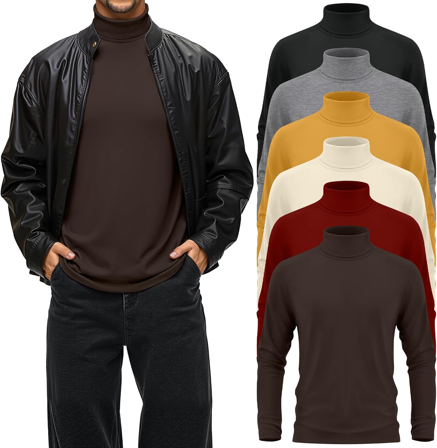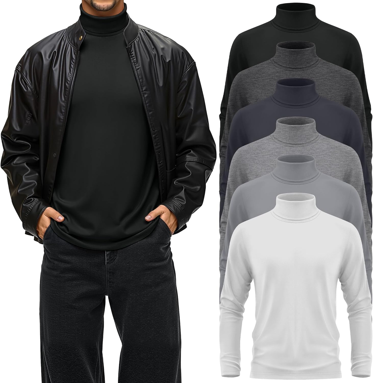 Features: The six-pack design provides consumers with a super high cost-effectiveness, allowing you to purchase multiple colors at one time without having to worry about choosing a single color. Meet your diverse needs. The basic long sleeve top for men is easy to care for, machine washable and not prone to shrinkage or fading. It retains its shape and color after washing, and the appearance and wearing experience of the clothing remain online after multiple washings. Specifications: Material: 60% Polyester, 35% Cotton, 5% Spandex Package includes: 3 x Turtle neck shirt men Notes: Manual measurement, please allow slight errors on size. The color may exist a slight difference due to different screen displays