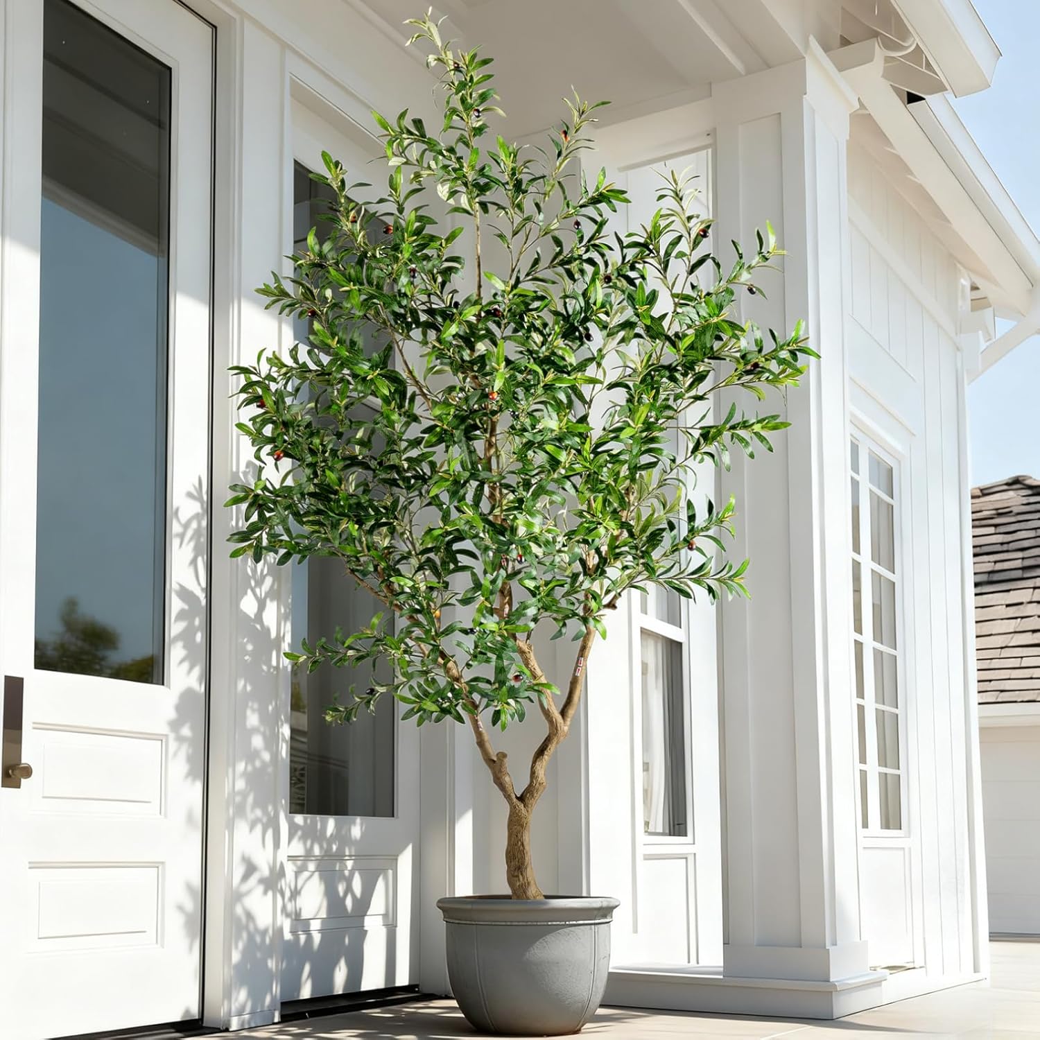 • Our artificial olive tree comes with a high-grade ceramic weighted white planter (high-temperature fired, scratch-resistant). Its minimalist design lets you replace it with terracotta/marble/concrete pots to match various styles. Versatile for living rooms, entryways, offices, villas, hotels—adds natural elegance, durable, enhancing interior grade, perfect for quality-focused, hassle-free luxury decor lovers.