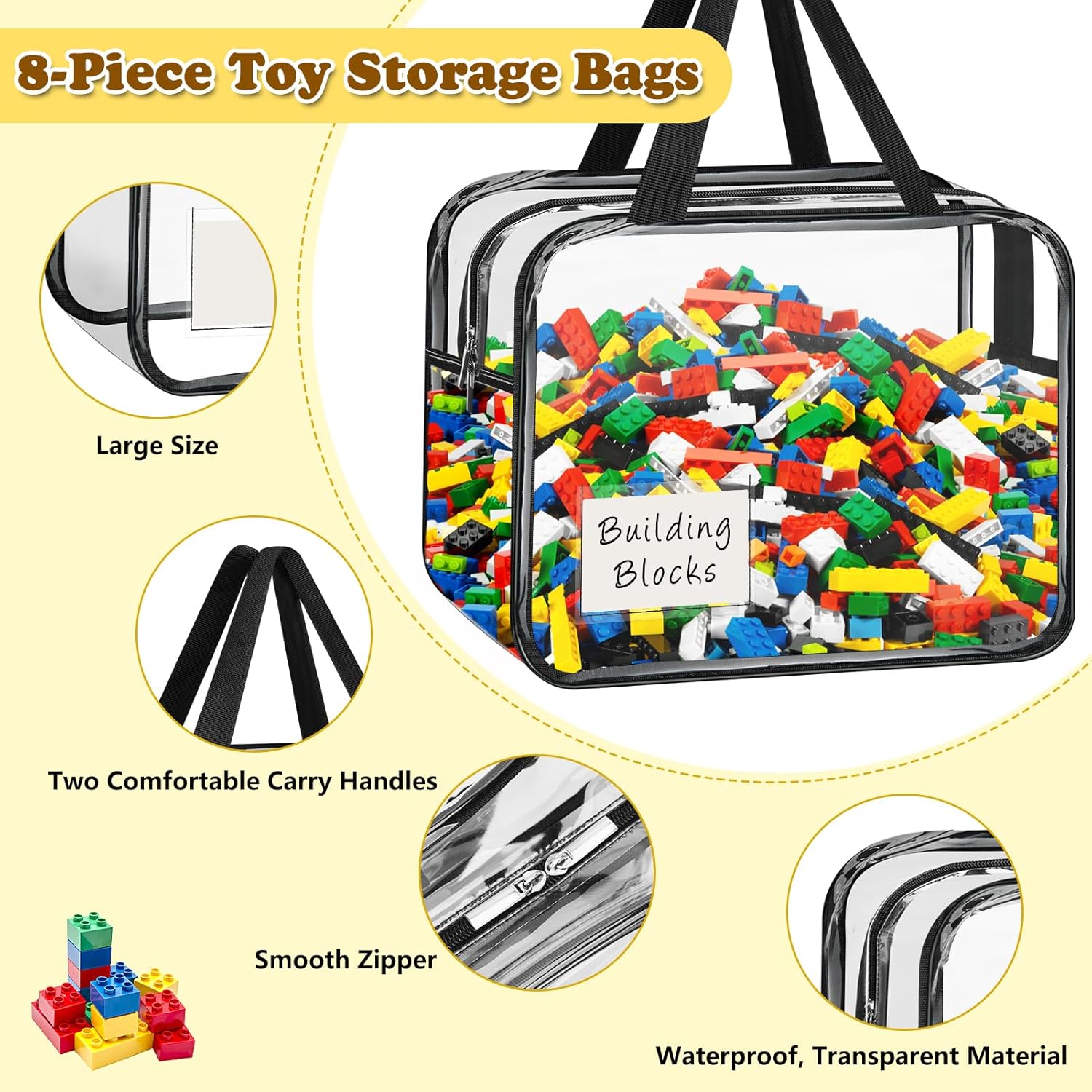 8 Pack XL Clear Toy Storage Bag with Name Tag& Manual Pocket, Waterproof Transparent PVC Toy Organizer Case for Lego Bricks, Board Games, Building Blocks, Puzzles