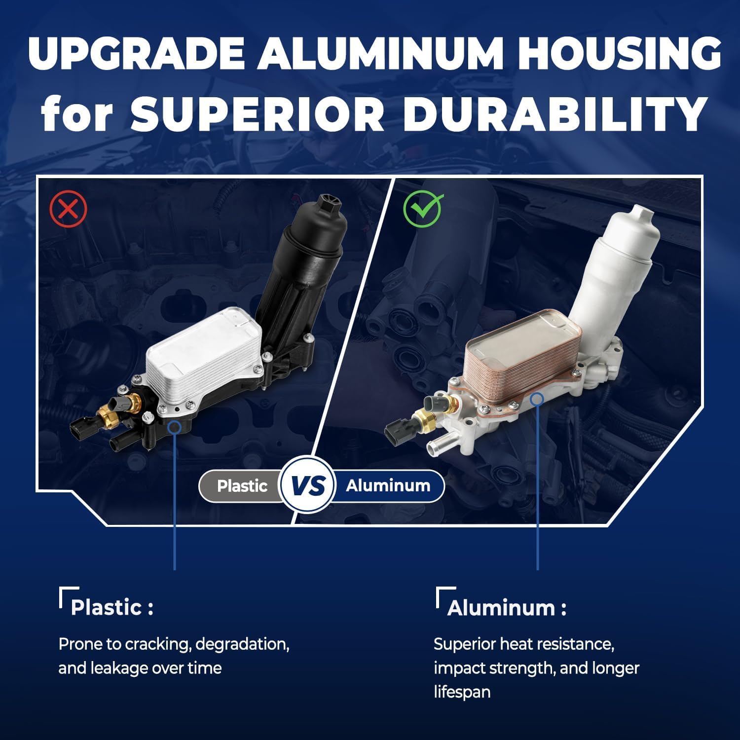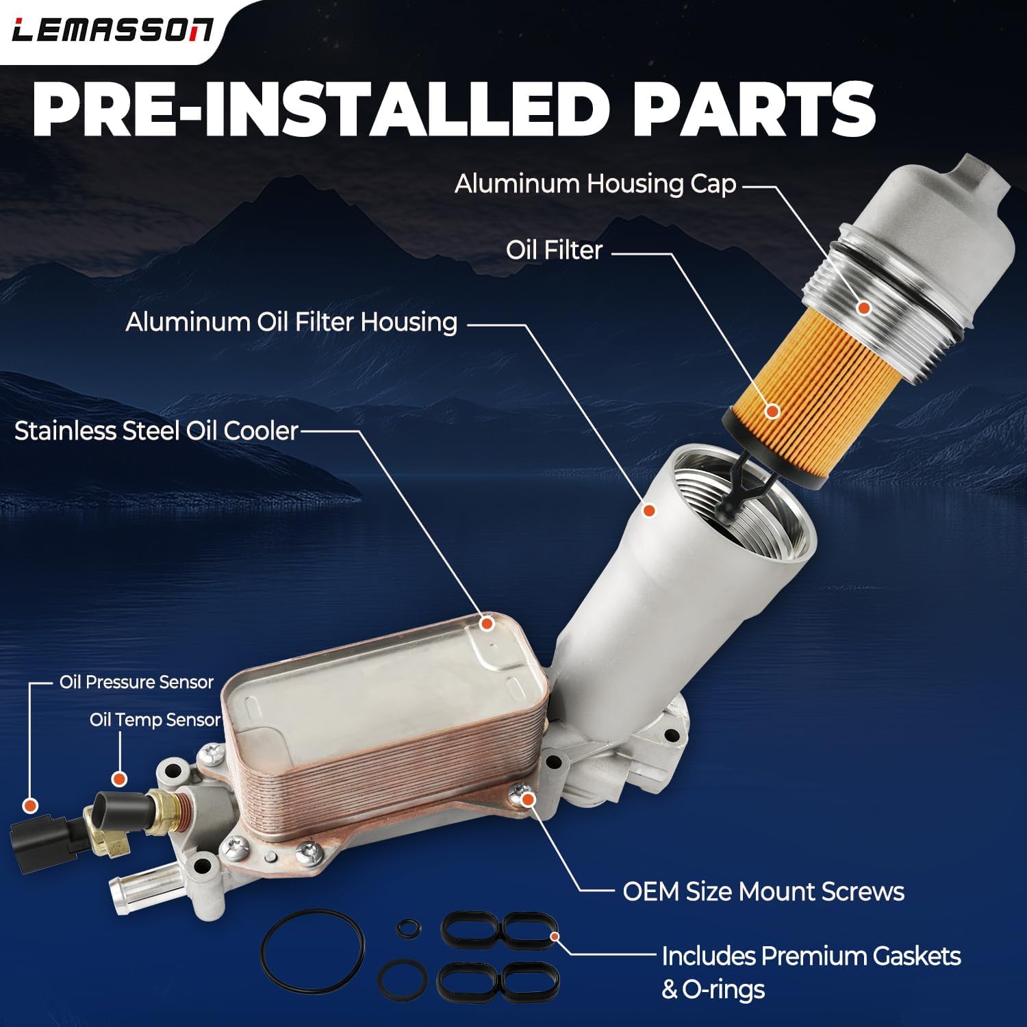 Aluminum Oil Filter Housing with Stainless Steel Oil Cooler & Aluminum Housing CapVEHICLE FITMENT:2017-2018 Jeep Cherokee V6 3.2L2016-2018 Jeep Grand Cherokee V6 3.6L2017-2018 Jeep Wrangler V6 3.6L2018 Jeep Wrangler Jk V6 3.6L2017-2018 Dodge Challenger V6 3.6L2017-2018 Dodge Charger V6 3.6L2016-2018 Dodge Durango V6 3.6L2017-2018 Dodge Grand Caravan V6 3.6L2017-2018 Dodge Journey V6 3.6L2017-2018 Chrysler 300 V6 3.6L2017-2018 Chrysler Pacifica V6 3.6L2017-2018 Ram 1500 V6 3.6L2017-2018 Ram ProMaster 1500 V6 3.6L2017-2018 Ram ProMaster 2500 V6 3.6L2017-2018 Ram ProMaster 3500 V6 3.6LAbout LemassonLemasson is a trusted brand dedicated to providing high-quality automotive parts for car enthusiasts and professional mechanics alike. As a leading supplier in the automotive aftermarket, we focus on delivering reliable, durable, and competitively priced replacement parts to ensure every customer has an exceptional experience with their vehicle repairs. Our products undergo strict quality control and meet OEM standards, using advanced manufacturing processes to guarantee performance and longevity.Whether you’re a DIY repair enthusiast or a professional technician, Lemasson is your reliable partner. We are committed to offering excellent customer service, ensuring your satisfaction throughout the selection, purchase, and installation process.