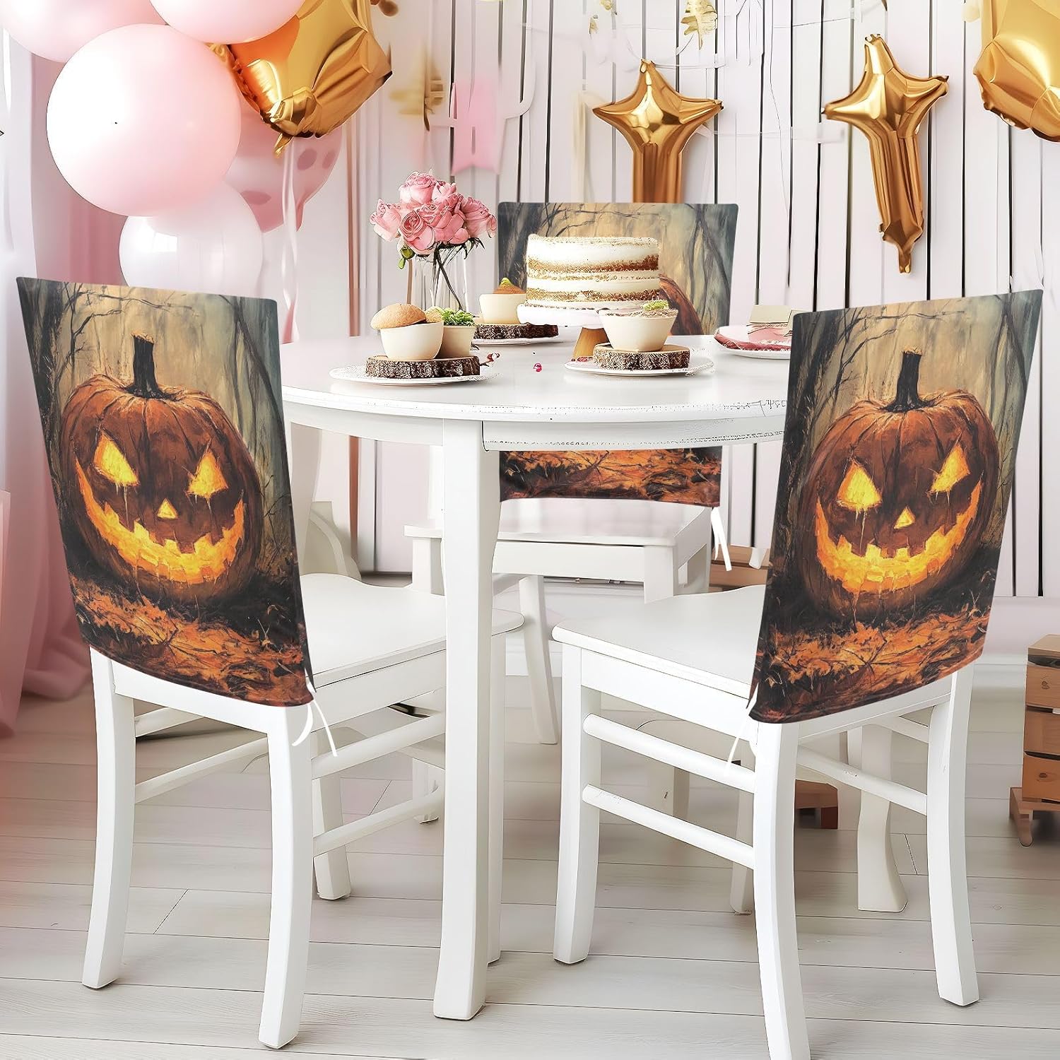 Chair Cover Material made of polyester,comfortable and soft to touch,reusable and suitable for long term use Features easy to install and remove, tie rope design at the bottom,machine washable Stylish Chair Decoration With beautiful pattern,it can be used for family party/ birthday party/wedding/ holiday party to add atmosphere, also can be used for chair decoration in living room, dorm, kitchen dining room,bedroom to bring protection to the chair while avoiding stains to dirty the chair back. Easy To Care Machine washable, Not washing with hot water, Not bleaching