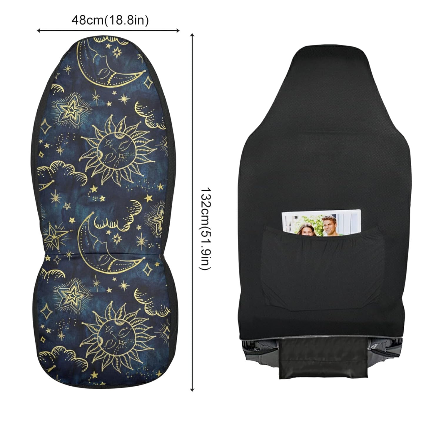 High-quality Material 92% polyester & 8% spandex & nylon Elastic and durable fabric One Size 51.9 x 18.8 in / 132 x 48 cm Fits almost all front seats of Sedan,Van, SUV, Jeep, Truck Intimate design Easy to put on and take off. Fully wrapped design with non-slip patches and elastic hooks protective role in all aspects. There is a large storage pocket on the back, which can organize small item. Vivid pattern Bright, vivid and colored lasting patterns could be interior decoration in your car. You will find the most favorite one from hundreds of beautiful patterns in the store. Great choice as gifts for Birthday, Valentine's Day, Thanksgiving Day, Christmas, Father's Day, Mother's Day, Coming of Age Ceremony. Tips: Hand wash or machine wash, dry in shade. Please use mild neutral detergent.