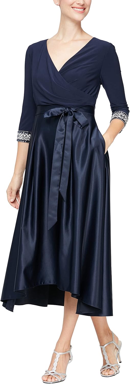 Make a statement at your next event with the Alex Evenings Women's Satin Ballgown. Crafted with a flowing satin circle skirt featuring hidden pockets, this gown combines high-end style with functionality. Its stretchy matte jersey bodice ensures a flattering fit, complemented by a V-neckline and elbow-length sleeves for refined elegance. The adjustable tie belt cinches the waist for a polished silhouette. Perfect for galas, weddings, and black-tie occasions, this long A-line dress blends classic design with modern touches. Elevate your wardrobe with a gown that balances comfort, style, and practicality.