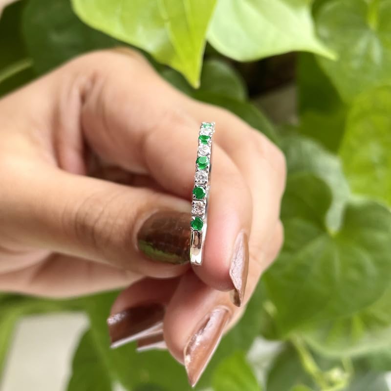 This Band Crafted in 925 Sterling Silver, available in 14K White, Yellow and Rose Gold Plating. Round Cut simulated Emerald & White Diamond set in prong setting.