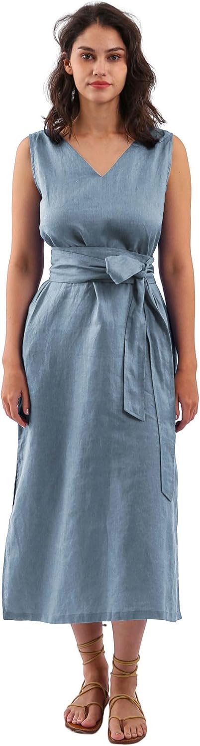 Amazhiyu Womens 100% Linen Summer V-Neck Midi Dresses Sleeveless with Pockets