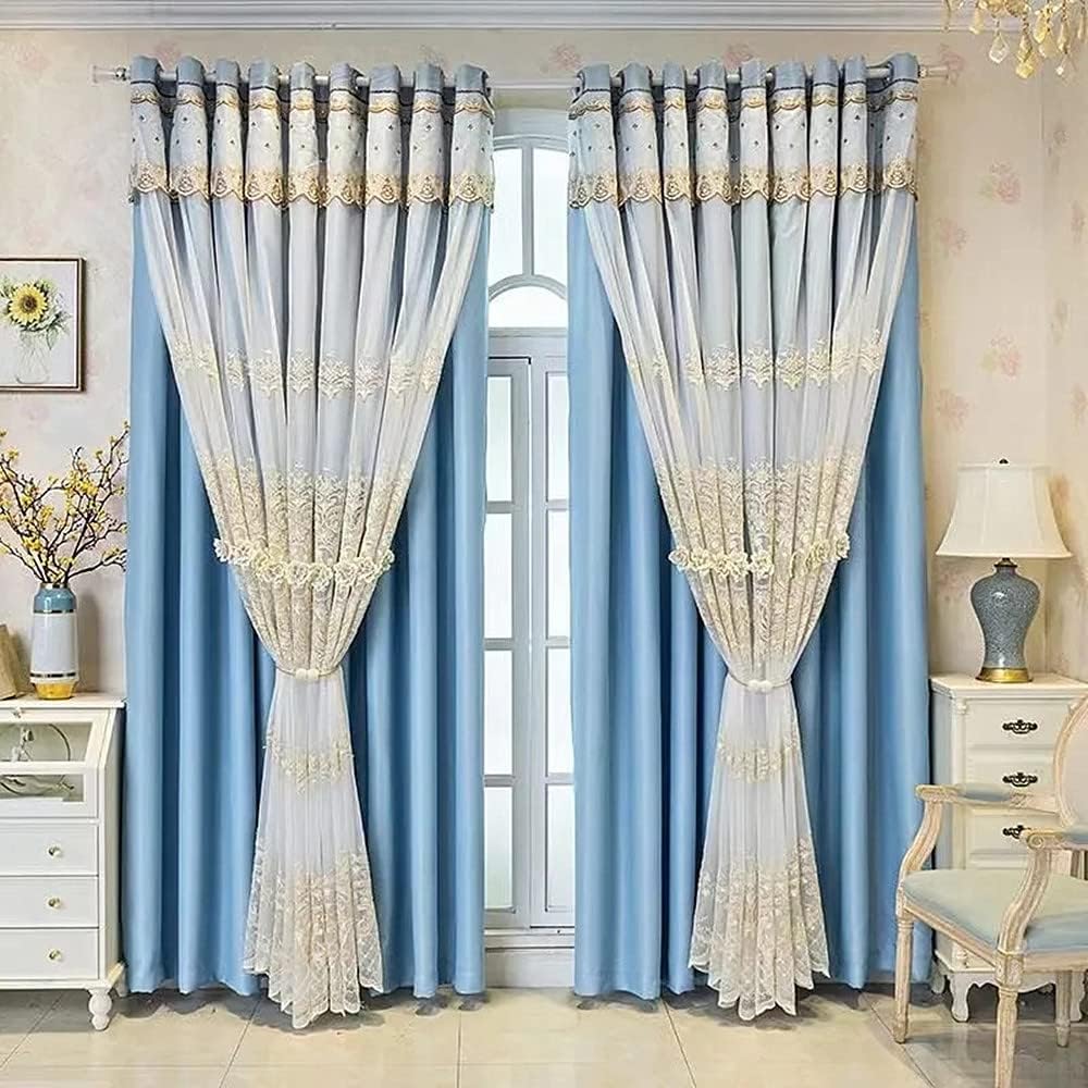 Features: Double layered curtain design, with one layer of solid color fabric curtains and another layer of embroidered sheer curtains, combining shading and aesthetics. The European style embroidery has improved the quality of the product.