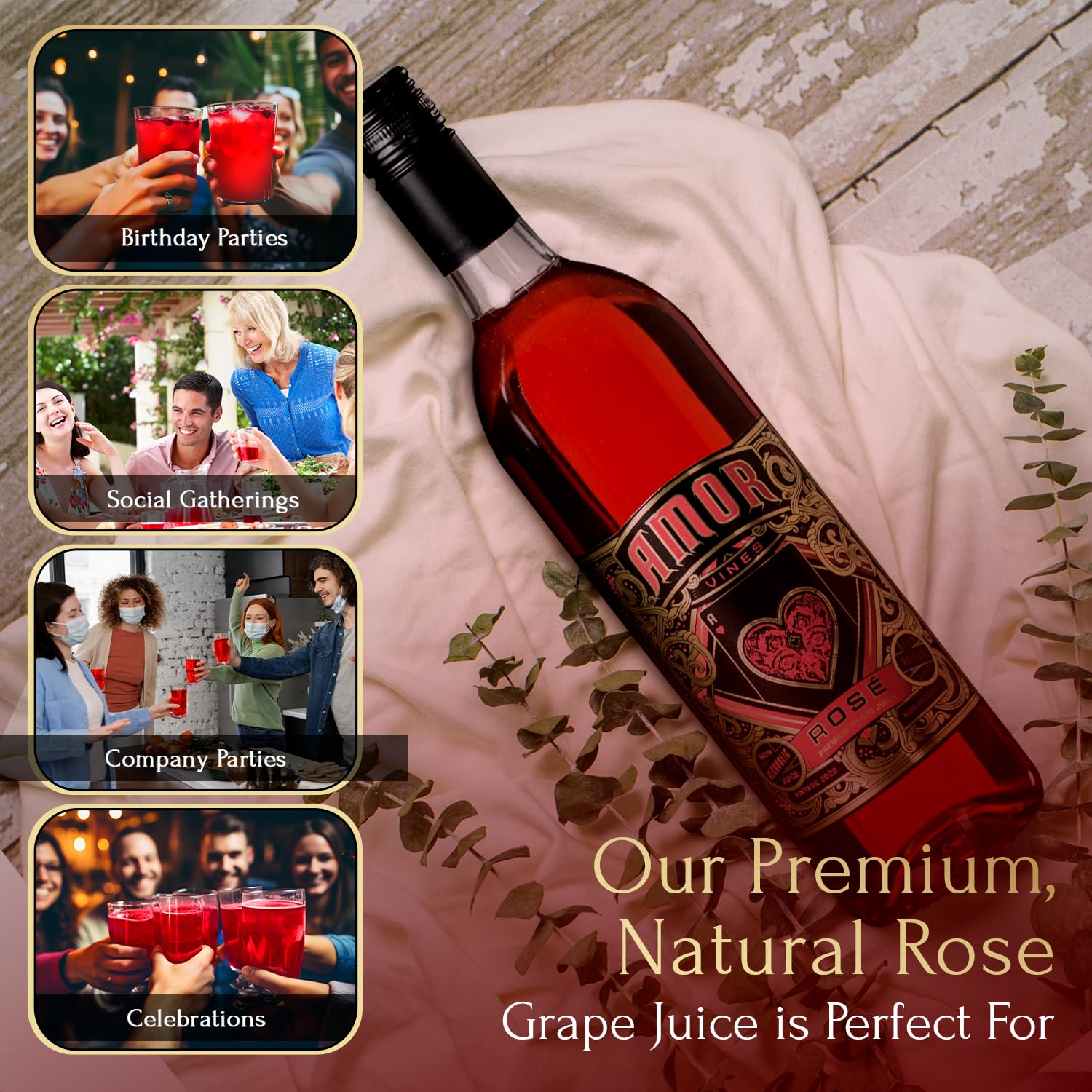 Authentic Grape Goodness! Indulge in the rich taste of Amor Vines natural fruit juice! Made solely from Rosé grapes, it boasts a bold, aromatic flavor that's a true delight for the taste buds. Each of these juice bottles encapsulates the essence of freshly pressed grapes, ensuring an authentic drinking experience. Whether it's a business event, a family gathering, or a simple dinner, this natural grapefruit juice is an excellent non-alcoholic option for any occasion. Health-Conscious Choice Opt for Amor Vines for a health-conscious refreshment! Our fresh juice is natural, brimming with antioxidants, and devoid of preservatives, sugar, or water. This minimally processed beverage promotes a robust immune system and is suitable for adults and children. Its nutritious profile offers a guilt-free option for those seeking a wholesome drink. Craftsmanship and Tradition Experience the essence of tradition with our fruit juice beverages! The grapes are juiced within hours of harvest and hot-pressed to lock in their maximum flavor. This unfiltered juice captures the homemade taste of Rosé grapes, adding a nostalgic touch to your table. With Amor Vines, relish in a product that upholds time-honored craftsmanship, delivering an unparalleled drinking experience with every sip.