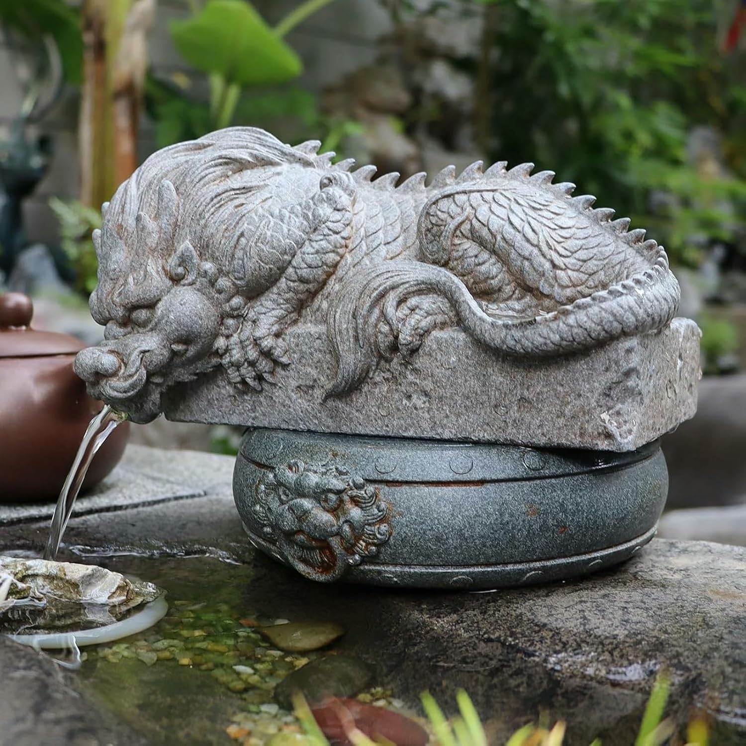 GFXYQPDNV Beautify your garden or outdoor space with this creative fish pond circulating fountain. This unique decorative feature, featuring an animal theme, is perfect for adding a touch of elegance to any setting, from fish ponds to garden patios to farmhouses. Its intricate details and realistic appearance make it a stunning and captivating focal point.*The meticulously sculpted head creates a dynamic and imposing presence, bringing life and charm to your garden.*Intricate details, sleek lines, and a flat base ensure stable placement.*The robust and energetic tail symbolizes growth and continued success.*The lifelike details and creative animal shape add unique charm to any space.*Create a dynamic and beautiful water feature that will catch the eye.Specifications:>Name: Outdoor garden animal simulation, automatic circulating water tank landscaping set, creative fish pond animal ornaments>Material: Synthetic stone>Color: Gray>Shape: Ancient Chinese dragon>Dimensions: 18*10*10cm/7*3.9*3.9inThis pond fountain is perfect for a variety of outdoor settings, such as poolside gardens, lawns, farmyards, or terraces. It's even more effective when paired with a rockery or pond.