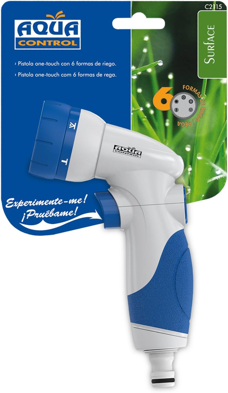 "Gun" one-touch "with 6 forms of irrigation. Gun made with ABS plastic (impact-resistant) and rubber that improves the grip. 50% more light than a metal one. Adjusts with a button.