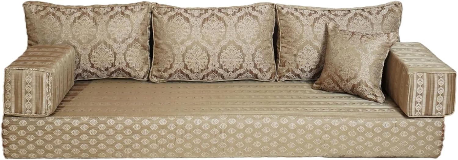 Bring elegance and comfort to your home with our Traditional Arabic Majlis Floor Sofa Set. Perfectly designed for floor seating, our handmade sofas embody the timeless beauty of Arabic furniture. Inspired by classic jalsa and majlis seating styles, this versatile floor couch offers a cozy and luxurious addition to your living room or lounge. The high-quality craftsmanship and luxurious cushions ensure comfort and durability, while the traditional Arabic design adds a cultural touch to any space.Please Note: You will receive the exact configuration and cushion thickness of the variant you select from the listing page.What’s Included in Your Set?If you choose 'Sofa + Ottoman + Pillows' you will get these:-1 Floor Seating Cushion (190 x 70 cm / 75 x 27 inch)-3 Backrest Pillows (70 x 50 / 27 x 20 inch)-2 Armrest Pillows (50 x 20 x 20 cm / 20 x 8 x 8 inch)-2 Small Pillows-1 Ottoman Couch (60 x 60 x 20 cm / 24 x 24 x 8 inch)-3 Pouf Pillows (70 x 50 cm / 27 x 20 inch)This sofa set comes in 12 separate pieces.If you choose 'Sofa + Ottoman' you will get these:-1 Floor Seating Cushion (190 x 70 cm / 75 x 27 inch)-3 Backrest Pillows (70 x 50 / 27 x 20 inch)-2 Armrest Pillows (50 x 20 x 20 cm / 20 x 8 x 8 inch)-2 Small Pillows-1 Ottoman Couch (60 x 60 x 20 cm / 24 x 24 x 8 inch)This sofa set comes in 9 separate pieces.If you choose 'Sofa Only' you will get these:-1 Floor Seating Cushion (190 x 70 cm / 75 x 27 inch)-3 Backrest Pillows (70 x 50 / 27 x 20 inch)-2 Armrest Pillows (50 x 20 x 20 cm / 20 x 8 x 8 inch)-2 Small PillowsThis sofa set comes in 8 separate pieces.The thickness of the FLOOR SEATING CUSHIONS will be based on the variant you choose from the listing page: 4" Thickness (10 cm) or 8" Thickness (20 cm)