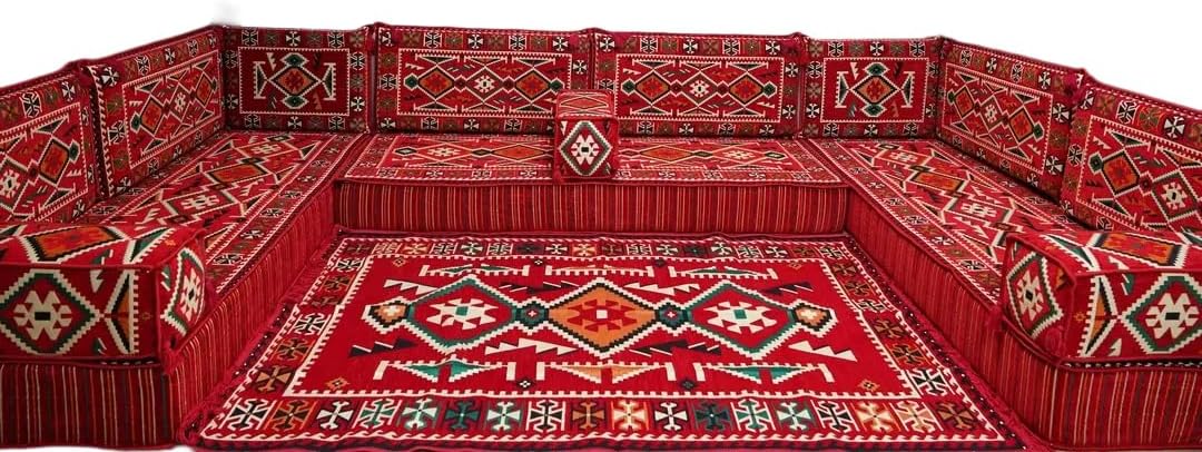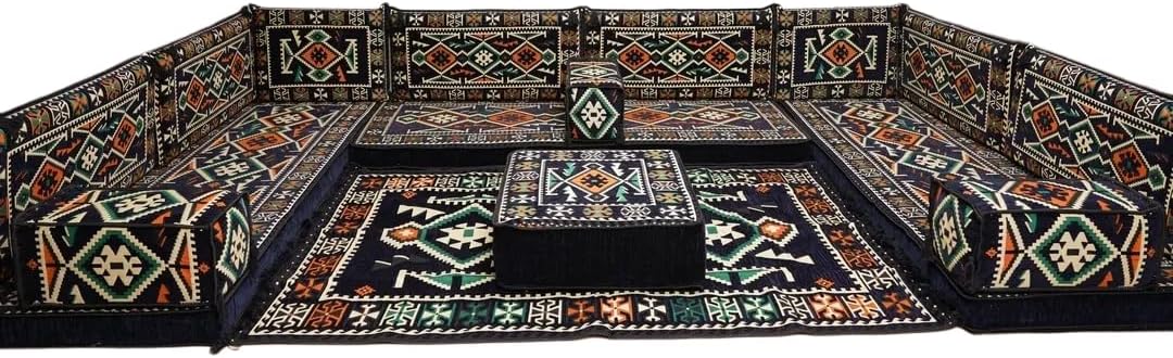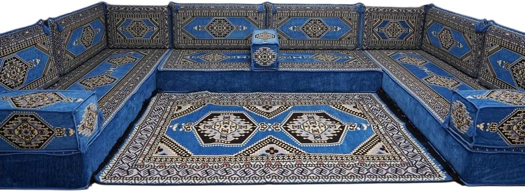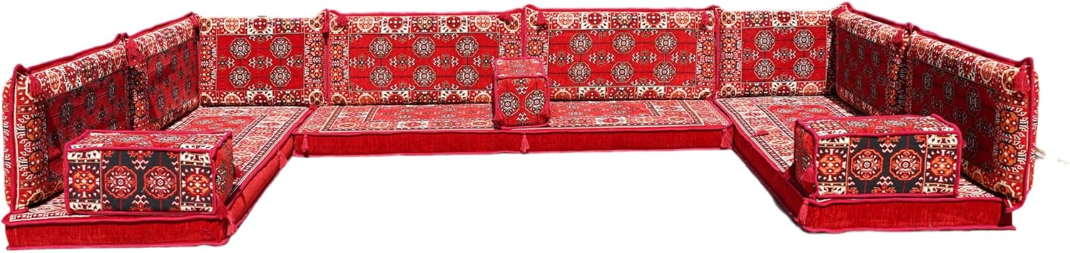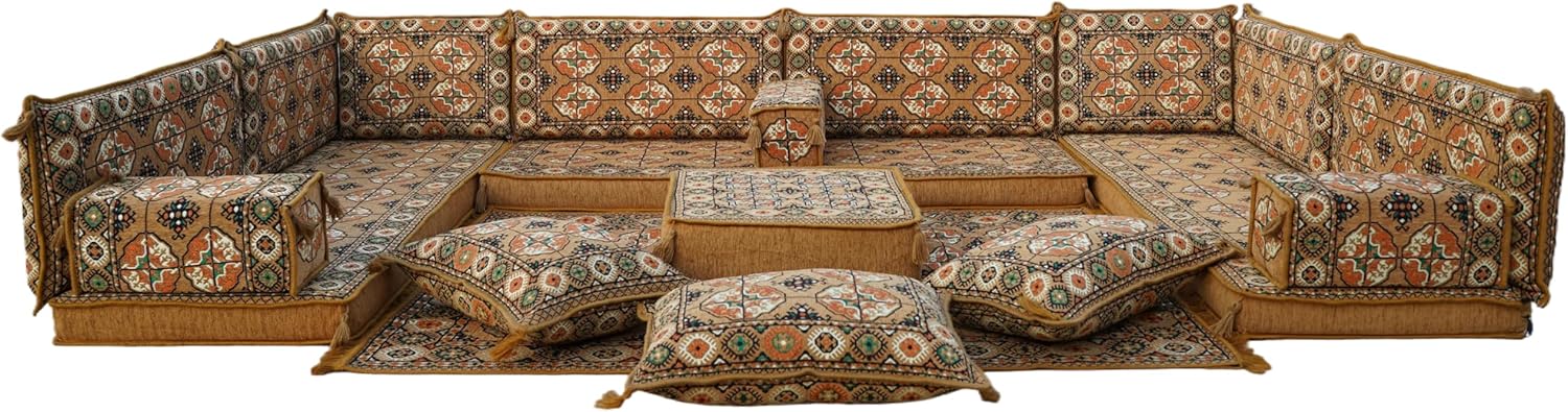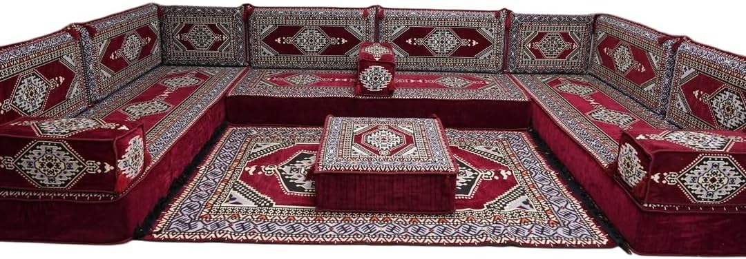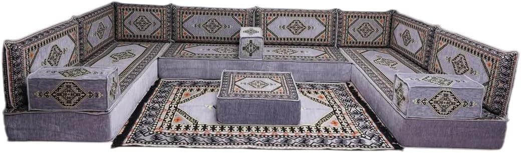 Bring elegance and comfort to your home with our Traditional Arabic Majlis Floor Sofa Set. Perfectly designed for floor seating, our handmade sofas embody the timeless beauty of Arabic furniture. Inspired by classic jalsa and majlis seating styles, this versatile floor couch offers a cozy and luxurious addition to your living room or lounge. The high-quality craftsmanship and luxurious cushions ensure comfort and durability, while the traditional Arabic design adds a cultural touch to any space.Please Note: You will receive the exact configuration and cushion thickness of the variant you select from the listing page.What’s Included in Your Set?If you choose 'U Sofa Full Set' you will get these:-3 Floor Seating Cushions (190 x 70 cm / 75 x 27 inch)-6 Large Backrest Pillows (95 x 40 x 10 cm / 37 x 16 x 4 inch)-2 Small Backrest Pillows (60 x 40 x 10 cm / 24 x 16 x 4 inch)-3 Pouf Pillows (70 x 50 cm / 27 x 20 inch)-3 Armrest Pillows (50 x 20 x 20 cm / 20 x 8 x 8 inch)-1 Matching Rug (120 x 180 cm / 47 x 71 inch)-1 Ottoman Couch (60 x 60 x 20 cm / 24 x 24 x 8 inch)This sofa set comes in 19 separate pieces.If you choose 'U Sofa + Rug + Ottoman' you will get these:-3 Floor Seating Cushions (190 x 70 cm / 75 x 27 inch)-6 Large Backrest Pillows (95 x 40 x 10 cm / 37 x 16 x 4 inch)-2 Small Backrest Pillows (60 x 40 x 10 cm / 24 x 16 x 4 inch)-3 Armrest Pillows (50 x 20 x 20 cm / 20 x 8 x 8 inch)-1 Matching Rug (120 x 180 cm / 47 x 71 inch)-1 Ottoman Couch (60 x 60 x 20 cm / 24 x 24 x 8 inch)This sofa set comes in 16 separate pieces.If you choose 'U Sofa + Rug' you will get these:-3 Floor Seating Cushions (190 x 70 cm / 75 x 27 inch)-6 Large Backrest Pillows (95 x 40 x 10 cm / 37 x 16 x 4 inch)-2 Small Backrest Pillows (60 x 40 x 10 cm / 24 x 16 x 4 inch)-3 Armrest Pillows (50 x 20 x 20 cm / 20 x 8 x 8 inch)-1 Matching Rug (120 x 180 cm / 47 x 71 inch)This sofa set comes in 15 separate pieces.If you choose 'U Sofa Only' you will get these:-3 Floor Seating Cushions (190 x 70 cm / 75 x 27 inch)-6 Large Backrest Pillows (95 x 40 x 10 cm / 37 x 16 x 4 inch)-2 Small Backrest Pillows (60 x 40 x 10 cm / 24 x 16 x 4 inch)-3 Armrest Pillows (50 x 20 x 20 cm / 20 x 8 x 8 inch)This sofa set comes in 14 separate pieces.The thickness of the FLOOR SEATING CUSHIONS will be based on the variant you choose from the listing page: 4" Thickness (10 cm) or 8" Thickness (20 cm)