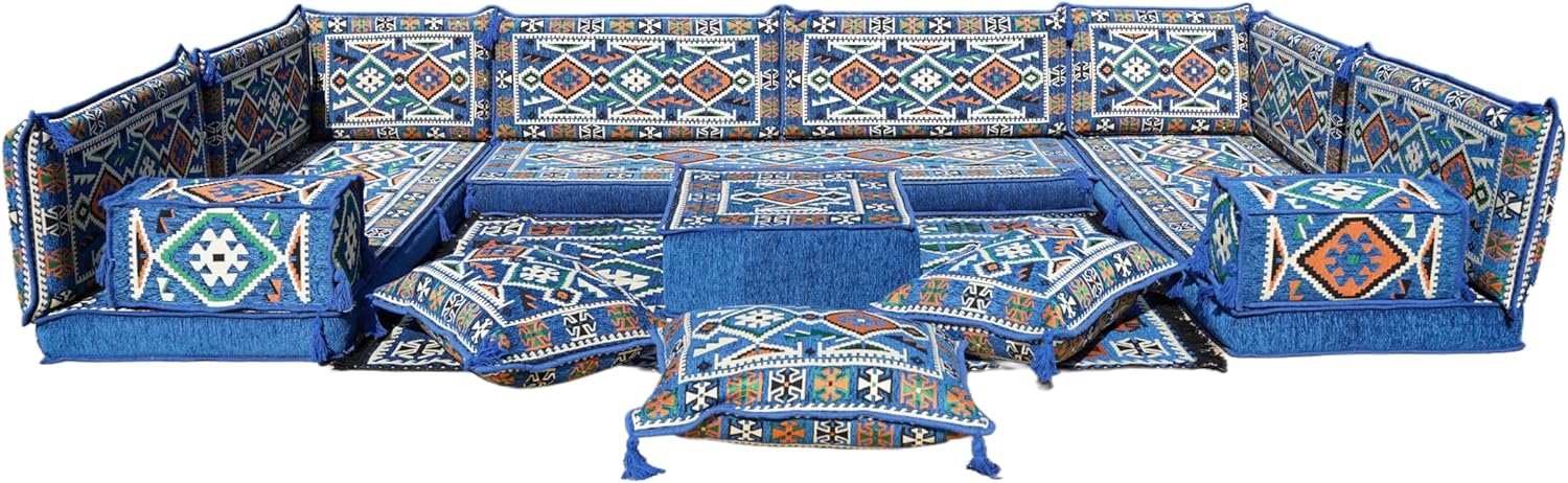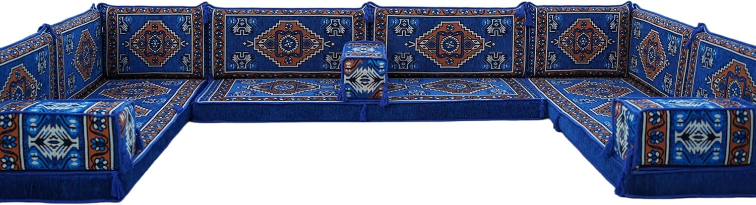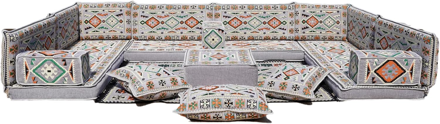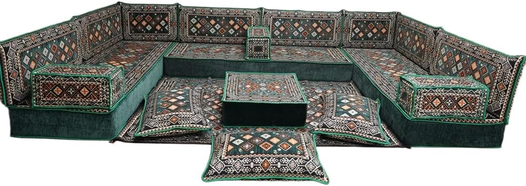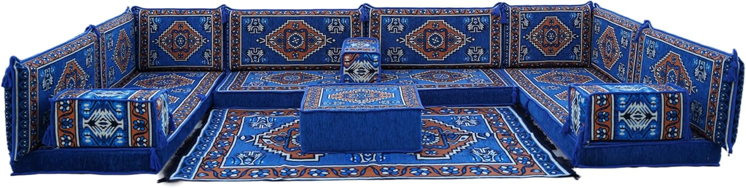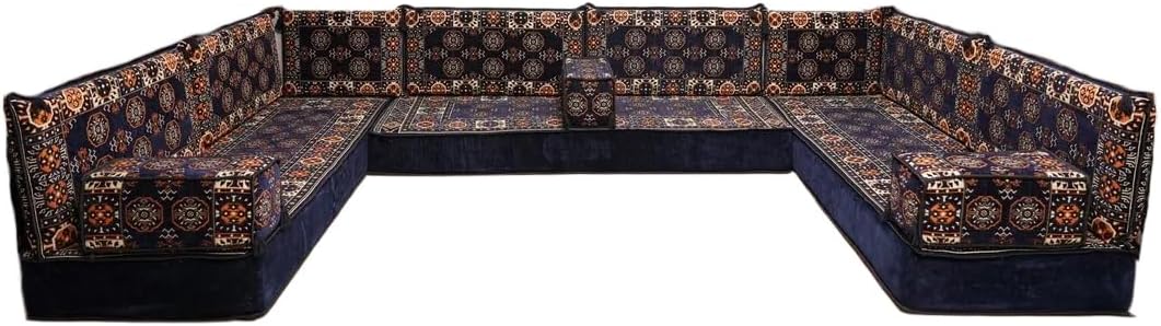 Bring elegance and comfort to your home with our Traditional Arabic Majlis Floor Sofa Set. Perfectly designed for floor seating, our handmade sofas embody the timeless beauty of Arabic furniture. Inspired by classic jalsa and majlis seating styles, this versatile floor couch offers a cozy and luxurious addition to your living room or lounge. The high-quality craftsmanship and luxurious cushions ensure comfort and durability, while the traditional Arabic design adds a cultural touch to any space.Please Note: You will receive the exact configuration and cushion thickness of the variant you select from the listing page.What’s Included in Your Set?If you choose 'U Sofa Full Set' you will get these:-3 Floor Seating Cushions (190 x 70 cm / 75 x 27 inch)-6 Large Backrest Pillows (95 x 40 x 10 cm / 37 x 16 x 4 inch)-2 Small Backrest Pillows (60 x 40 x 10 cm / 24 x 16 x 4 inch)-3 Pouf Pillows (70 x 50 cm / 27 x 20 inch)-3 Armrest Pillows (50 x 20 x 20 cm / 20 x 8 x 8 inch)-1 Matching Rug (120 x 180 cm / 47 x 71 inch)-1 Ottoman Couch (60 x 60 x 20 cm / 24 x 24 x 8 inch)This sofa set comes in 19 separate pieces.If you choose 'U Sofa + Rug + Ottoman' you will get these:-3 Floor Seating Cushions (190 x 70 cm / 75 x 27 inch)-6 Large Backrest Pillows (95 x 40 x 10 cm / 37 x 16 x 4 inch)-2 Small Backrest Pillows (60 x 40 x 10 cm / 24 x 16 x 4 inch)-3 Armrest Pillows (50 x 20 x 20 cm / 20 x 8 x 8 inch)-1 Matching Rug (120 x 180 cm / 47 x 71 inch)-1 Ottoman Couch (60 x 60 x 20 cm / 24 x 24 x 8 inch)This sofa set comes in 16 separate pieces.If you choose 'U Sofa + Rug' you will get these:-3 Floor Seating Cushions (190 x 70 cm / 75 x 27 inch)-6 Large Backrest Pillows (95 x 40 x 10 cm / 37 x 16 x 4 inch)-2 Small Backrest Pillows (60 x 40 x 10 cm / 24 x 16 x 4 inch)-3 Armrest Pillows (50 x 20 x 20 cm / 20 x 8 x 8 inch)-1 Matching Rug (120 x 180 cm / 47 x 71 inch)This sofa set comes in 15 separate pieces.If you choose 'U Sofa Only' you will get these:-3 Floor Seating Cushions (190 x 70 cm / 75 x 27 inch)-6 Large Backrest Pillows (95 x 40 x 10 cm / 37 x 16 x 4 inch)-2 Small Backrest Pillows (60 x 40 x 10 cm / 24 x 16 x 4 inch)-3 Armrest Pillows (50 x 20 x 20 cm / 20 x 8 x 8 inch)This sofa set comes in 14 separate pieces.The thickness of the FLOOR SEATING CUSHIONS will be based on the variant you choose from the listing page: 4" Thickness (10 cm) or 8" Thickness (20 cm)