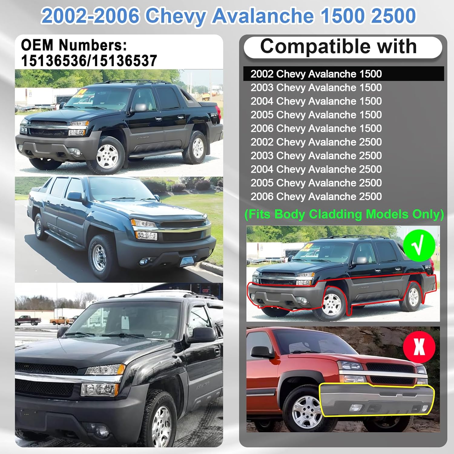 | Compatible with Vehicle Type | 02 03 04 05 06 Chevy Avalanche Pickup with Body Cladding |