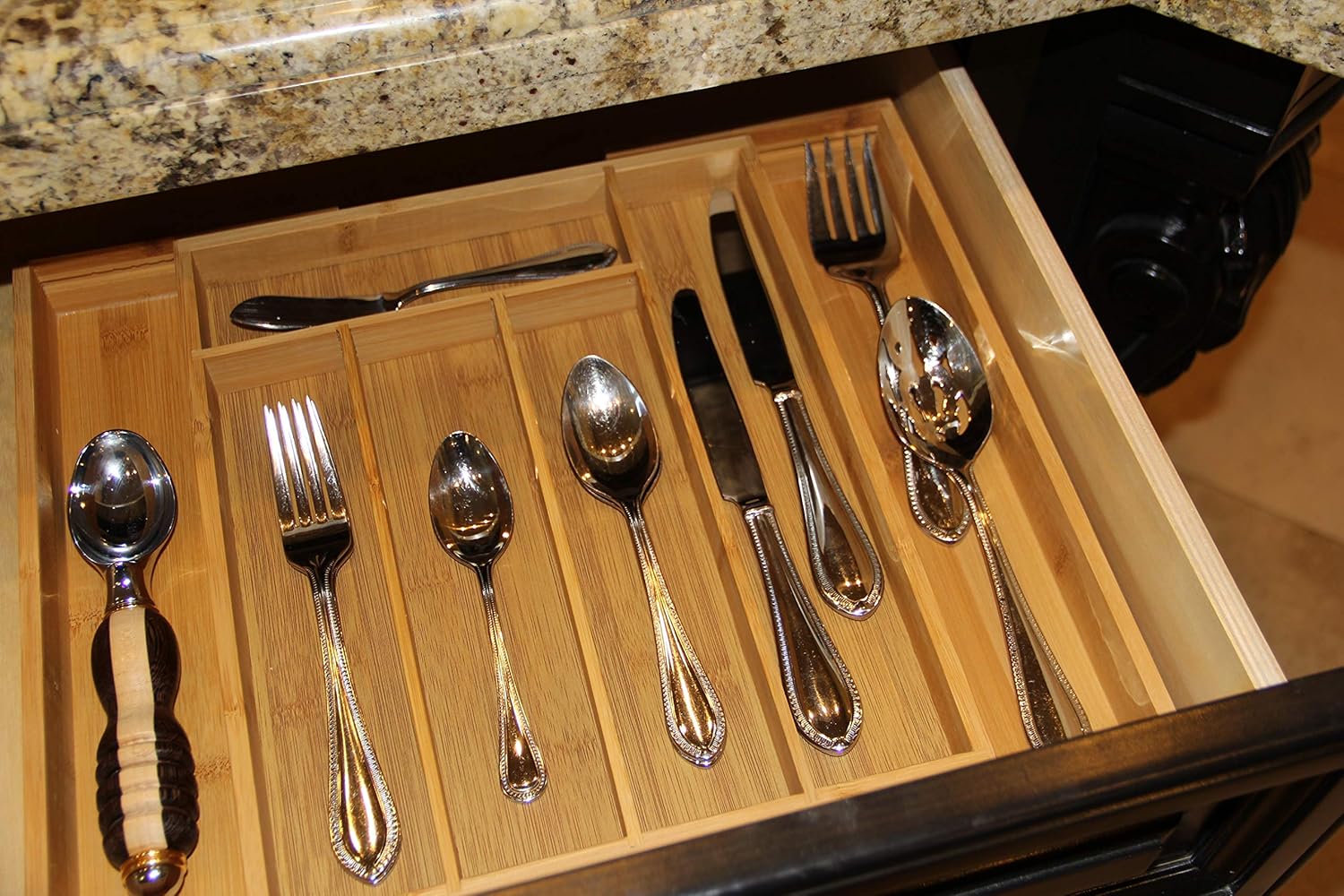Bamboo Panda: 7 Compartment Adjustable Solid Bamboo Drawer Organizer: Kitchen Utensil Holder, Project Organizer, Tray Divider System, Makeup Storage, Expandable