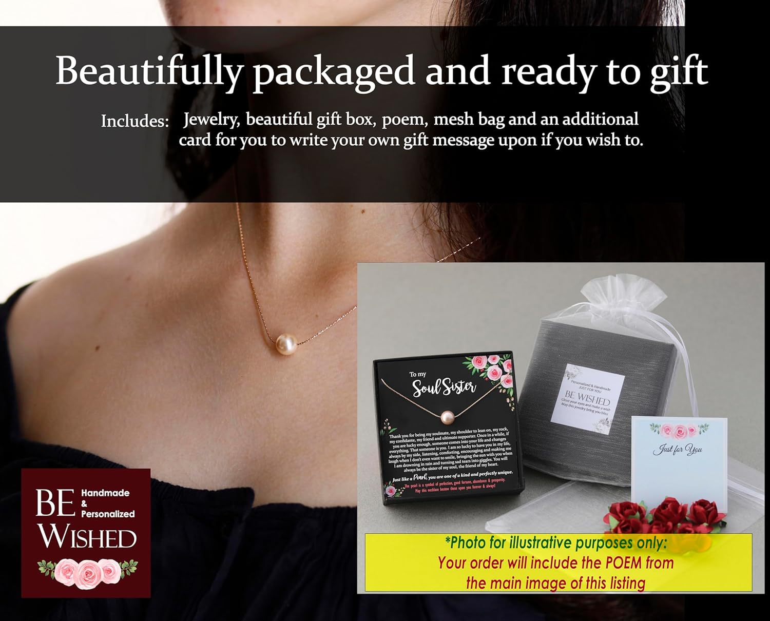 Celebrate the meaningful bond between you and your best friend with this stylish top quality handmade jewelry gift. Pearls represent the love bond between you and your loved ones like the essential relationship between the strong, resilient, and iridescent mother of pearl of the inner shell and the pearl created within. Pearl necklaces are a classic piece of jewelry that can be worn by any woman regardless of style, fashion, or age. Pearls are, as Jackie Kennedy famously declared, always appropriate. And as Ki Hackney, founder of Style magazine said, “You can’t ever go wrong with pearls. Perhaps pearls are a girl’s best friend after all.” This pearl necklace comes gift-wrapped with a heart felt message that gets it "spot on"-making it not only a perfect but meaningful present. It is durable and meticulously handcrafted from only the best materials. Because we believe that good gifts should not only be beautiful & thoughtful, but that they should last and be cherished. D E T A I L S > 100% Handcrafted with love from top quality materials only! > High quality14K Rose Goldfilled chain (not just plated-perfect for sensitive skin) > Necklace chain is our exclusive ultra-shine strong chain. > Nickel-Free > necklace is 18” long > Pearl measures 8mm / 0.31" W H Y _ B E W I S H E D Established at 2013, our jewelry studio is a well renowned, experienced jewelry studio that strives to create high quality, durable jewelry. When ordering a jewelry gift from Be Wished you can rest assured you will be getting a 100% top quality jewel that is 100% handmade with love. Because making beautiful quality gifts that bring joy to people has been our passion for years.