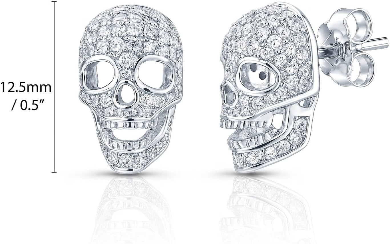 These skull earrings redefine gothic glamour. Crafted in sterling silver with shimmering cubic zirconia, they bring a daring twist to classic sparkle. Perfect for bold, fashion-forward women and collectors of unique statement studs or dangles. Crafted with fine 925 sterling silver, nickel free. Set with cubic zirconia CZ. Latch backs. Imported.DISCLAIMER: Carat weight of CZ is approximate. Intended for adult women.