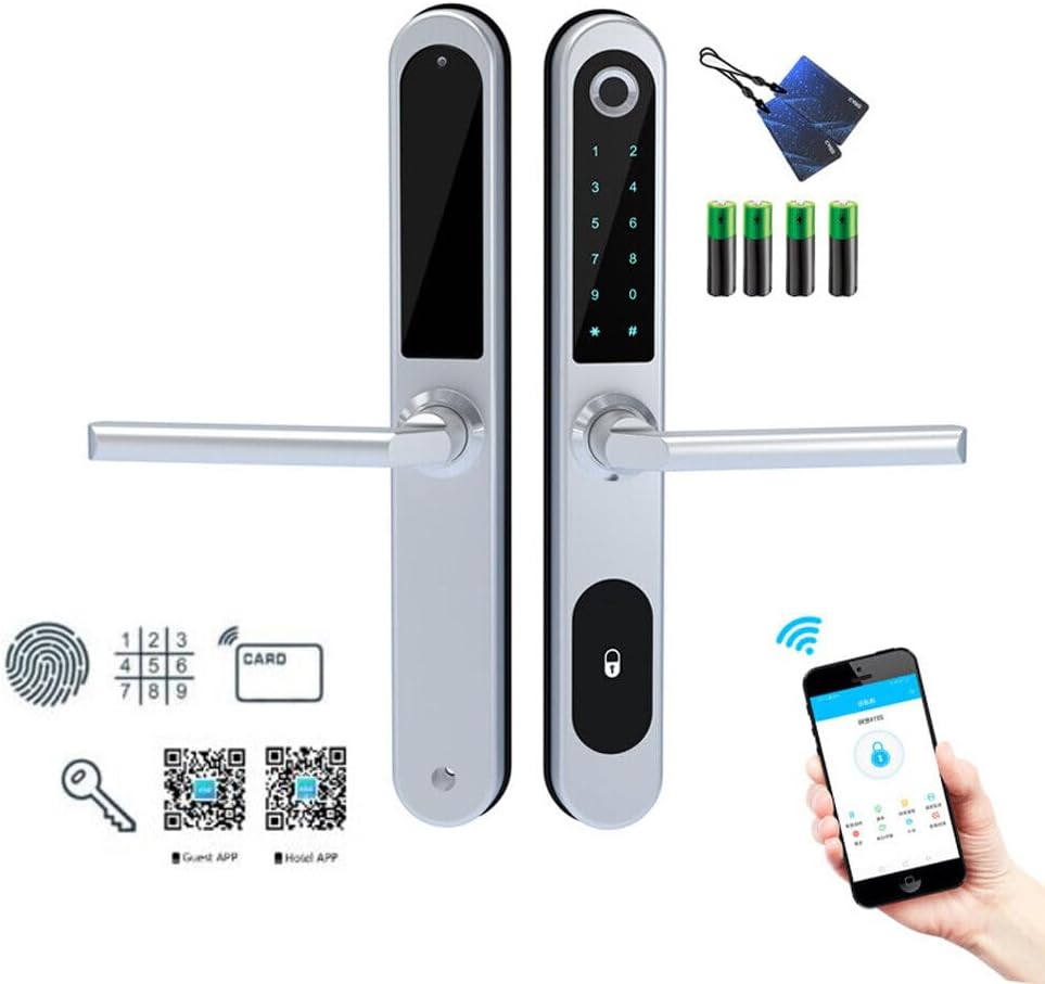 Note: auxiliary lock (no lock body) Main materials:Insulating aluminum alloy. Main board adopts Financial-grade security chip Original bio-semiconductor fingerprint scanner imported from Sweden. Modern fashion touchscreen panel. Changeable function between passage lock and household lock. Dry finger can use the fingerprint lock normally. 9V batteries backup power interface. Low voltage alarm function. Unlock ways: fingerprint + code + card + key+app. Fingerprint collected time: <1s. FAR: <0.00001%. FRR: <0.01%. Capacity: 51pcs fingerprints + 1000 cards + 250 group codes. Available cards: Mifare1 IC/S50 card. Working Temperature: 0 °C ~ + 70 °C. Static current/Dynamic current :<65μA/<350mA. Power supply: 6V (4*1.5V AA alkaline batteries). Battery life: normally opening door for 100,000 times. Size:315mmx42mm. App software:TTLock app.