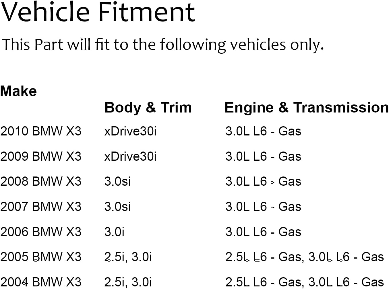 This part fits:: (fits years): Model: 2008-2013: 128i: 2008-2013: 135i: 2006-2006: 325i: 2006-2006: 325xi: 2007-2012: 328i: 2007-2008: 328xi: 2006-2006: 330i: 2006-2006: 330xi: 2007-2013: 335i conv: 2007-2013: 335i Coupe: 2009-2012: 335iX: 2011-2013: 335is: 2007-2008: 335xi: 2004-2007: 525i: 2006-2007: 525xi: 2008-2010: 528i: 2008-2008: 528xi: 2004-2007: 530i: 2006-2007: 530xi: 2008-2010: 535i: 2008-2008: 535xi: 2004-2005: 545i: 2006-2010: 550i: 2004-2005: 645Ci: 2006-2010: 650i: 2002-2005: 745i: from 03/02 : 2002-2005: 745Li: from 03/02 : 2006-2008: 750i: 2006-2008: 750Li: 2004-2006: 760i: 2003-2008: 760Li: from 03/02 : 2008-2013: M3: 2006-2010: M5: 2006-2010: M6: 2004-2010: X3: 2002-2013: X5: from 03/02 : 2008-2013: X6: 2003-2008: Z4