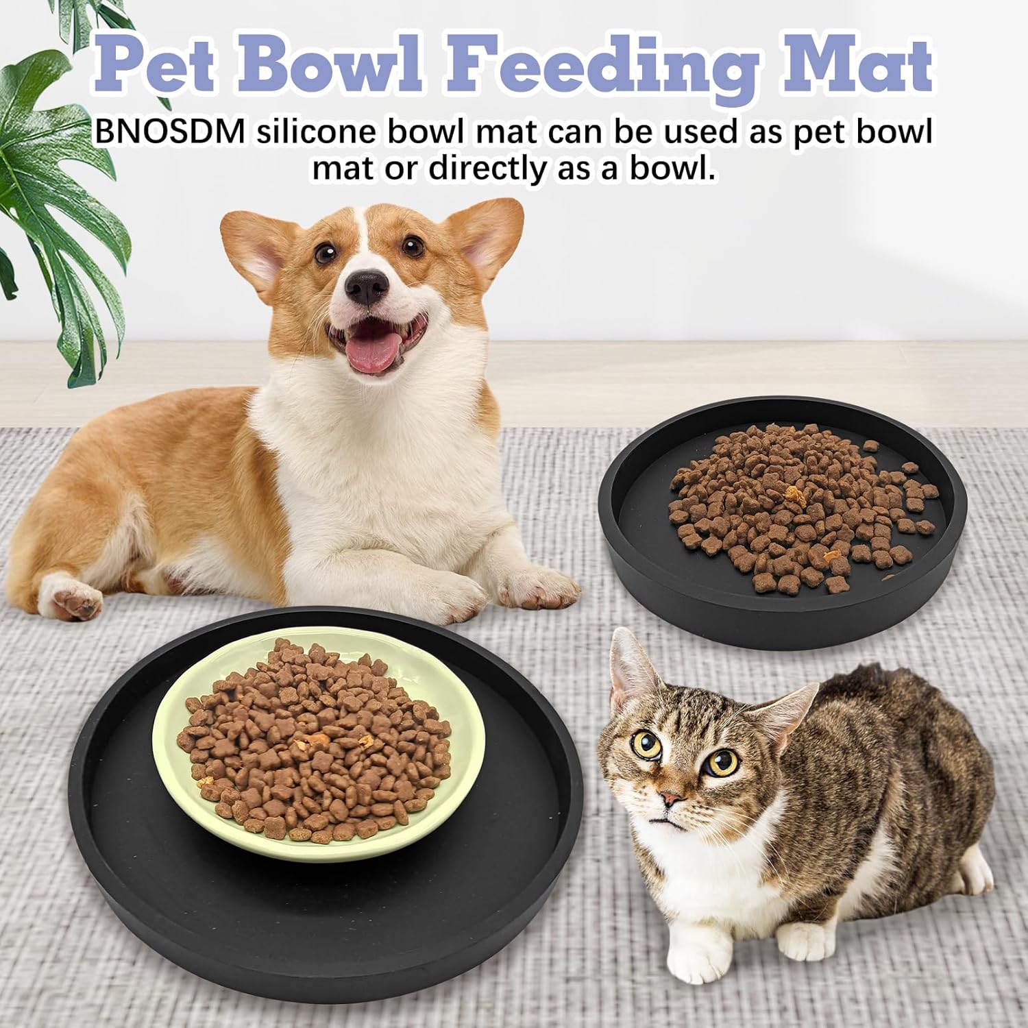 The combination of 2 pcs black dog feeding mat and 2 pcs double dog food bowl is a good choice for newbie starter parents!Black Silicone Pet Food Mats Features:1.Durable Silicone Material: BNOSDM silicone cat food mat is crafted from high-quality, sturdy, and stable silicone. 2.Multi-functional: BNOSDM silicone pet mat can not only serve as a protective base for pet food bowls, but also function as a silicone cat bowl to ensure that pets keep their whiskers clean while eating.3.Easy to clean: The surface of the cat water bowl mat is simple and smooth. Pet silicone placemat can be wiped with a damp cloth or directly rinsed with water. Double Dog Food Bowls Features:1.Three-In-One Design: Feed food and water separately to keep food fresh and maintain a healthy diet for dogs and cats. 2.Non-Slip And Spill-Proof: Comes with four non-slip pads to reduce movement; bowl pads catch most spills and splashes and reduce floor messes.3.Reliable Material: Stainless steel dog bowl and plastic bowl mat combination is sturdy and durable for long-term use, so you can feed your pet with confidence.Product List:2X Silicone Cat Feeding Dish2X Double Dog Food BowlsSpecification:7.1x0.79in /15.35 x7.87x1.57 in