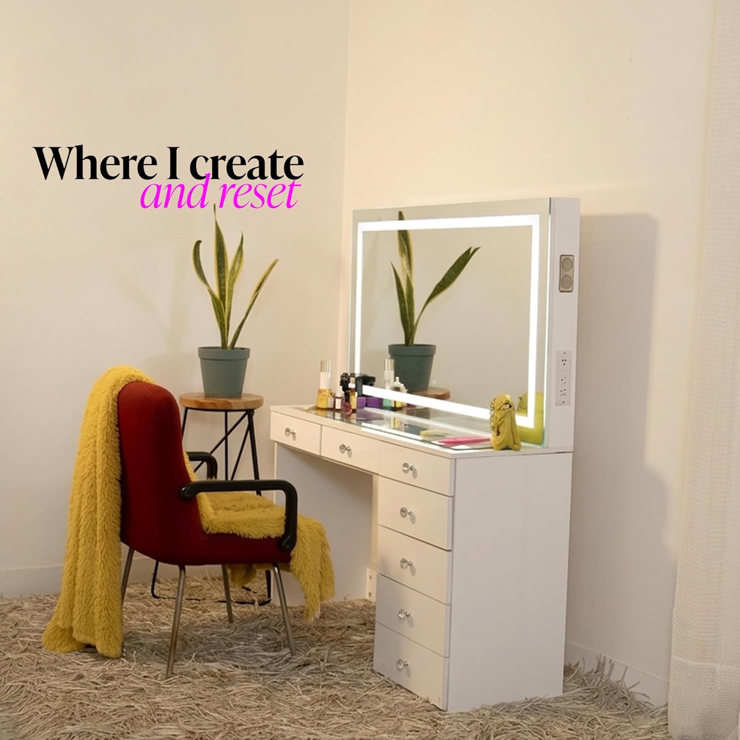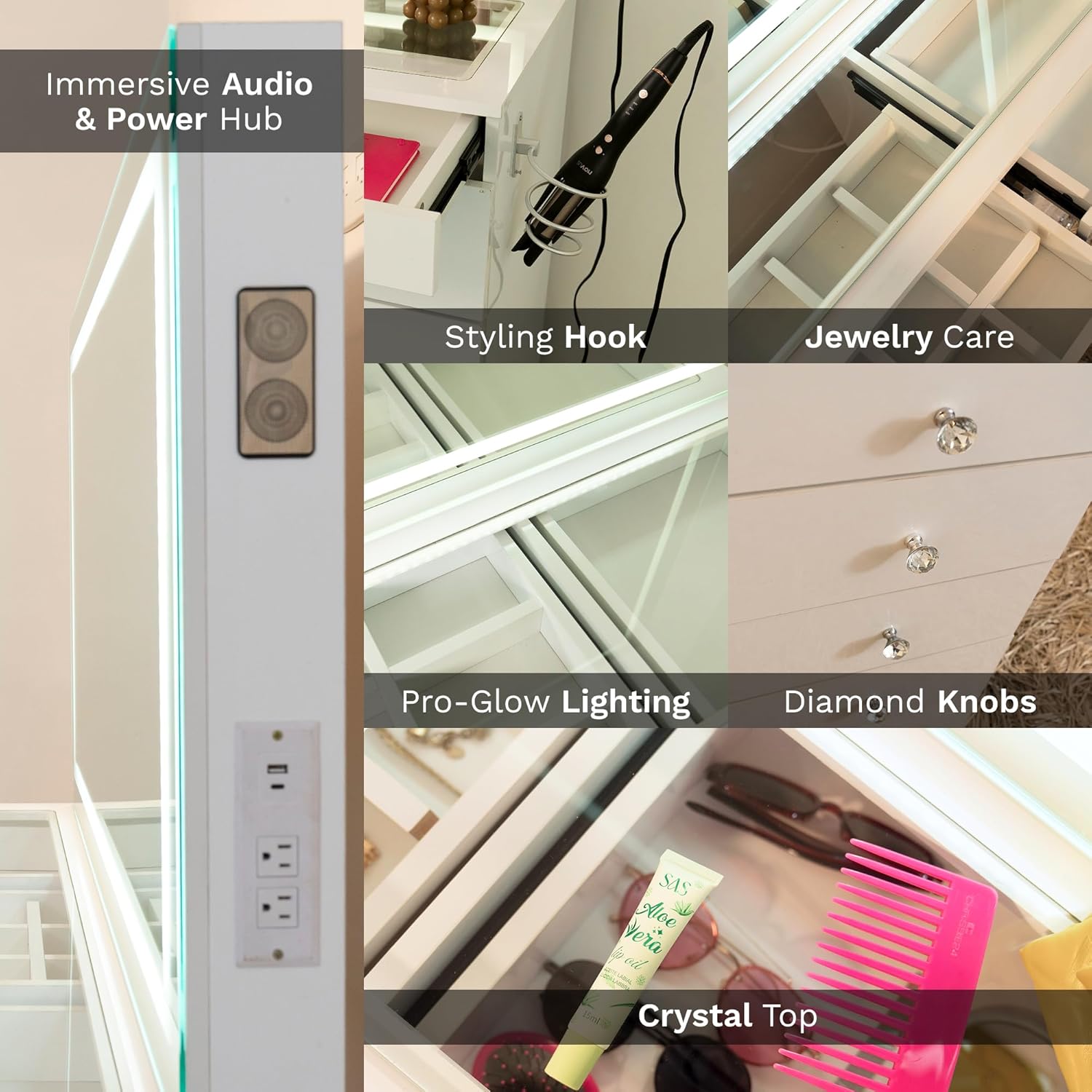 | Included Components | Vanity Desk, LED Mirror, Built-In Bluetooth Speakers, Tempered Glass Top, Power Outlet (110V with USB-A & USB-C), Jewelry Divider, Hair Dryer Holder, Assembly Hardware, Installation Instructions |