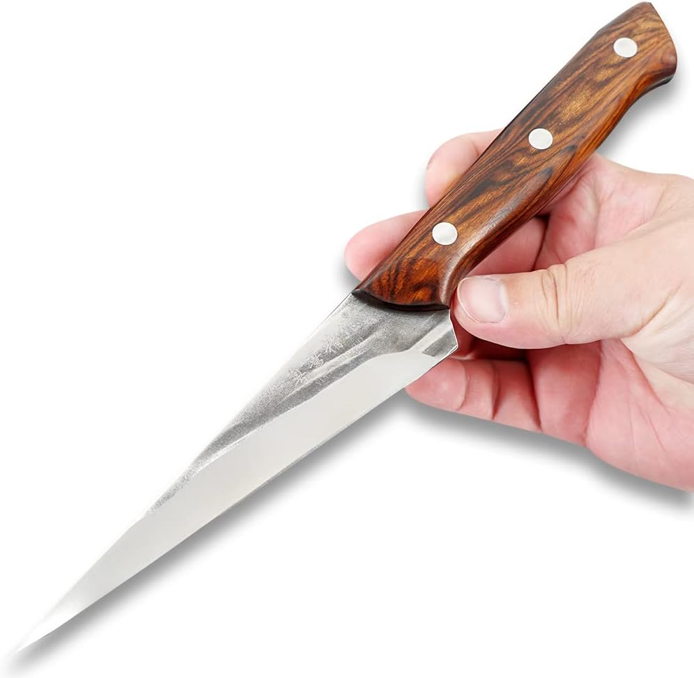 PRODUCT PARAMETERSOverall Length: 11.02"(280mm)Blade Length: 5.91"(150mm)Handle Length: 4.92"(125mm)Blade Thickness: 0.08"(2.0mm)Blade Width: 1.38"(35mm)Blade Material: 5Cr15Mov SteelBlade Hardness: 58±2HRCBlade Finish: Handmade ForgedHandle: African Rosewood&Rivet FixingWeight 5.29oz.(150g)Use: food carving knife,chef carving knife,fruit platter knife,fruit vegetable carving knife.