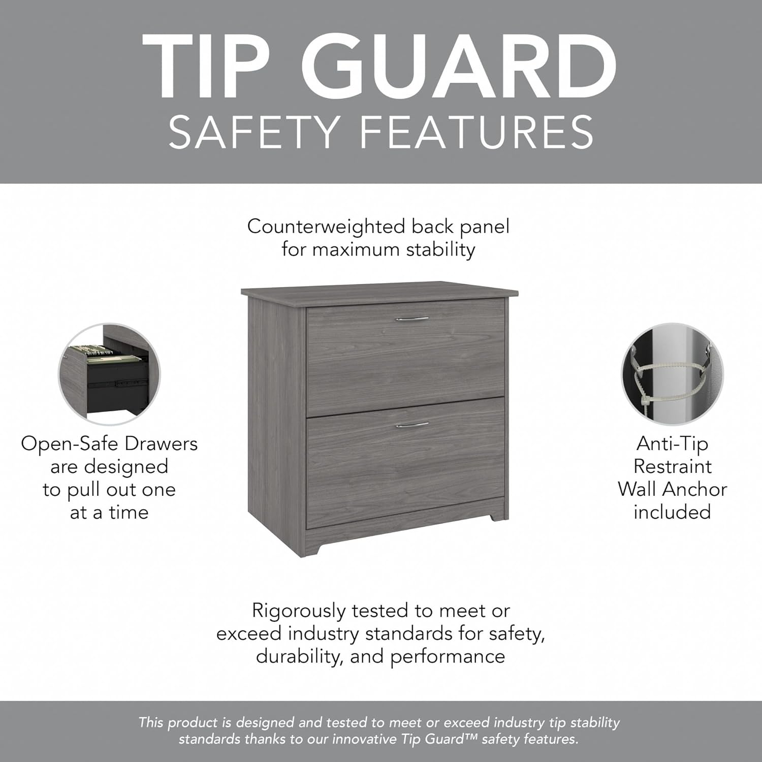 The Bush Furniture Cabot 2 Drawer Lateral File Cabinet presents a home office storage solution with transitional style. Two spacious file drawers open on smooth full-extension ball bearing slides for an effortless reach to all your letter, legal, and A4-size paperwork. Each drawer can support up to 60 pounds of materials. The height of the 2 Drawer File Cabinet matches that of coordinating Cabot Computer Desks to offer an extended work surface when placed side by side. The innovative Open-Safe Drawers are designed to pull out one at a time for improved stability on both hard and carpeted floors. Stylish metal hardware complements your choice of several traditional and contemporary finish options for an appearance that works with your own space and taste. This lateral filing cabinet has been rigorously tested to meet or exceed ANSI/SOHO quality standards for safety and performance and is backed by the Bush Furniture 1 Year Manufacturer's Warranty. See the full Cabot Collection for coordinating items to complete your transitional workspace, including desks, chairs, storage cabinets, bookcases, and more (sold separately).