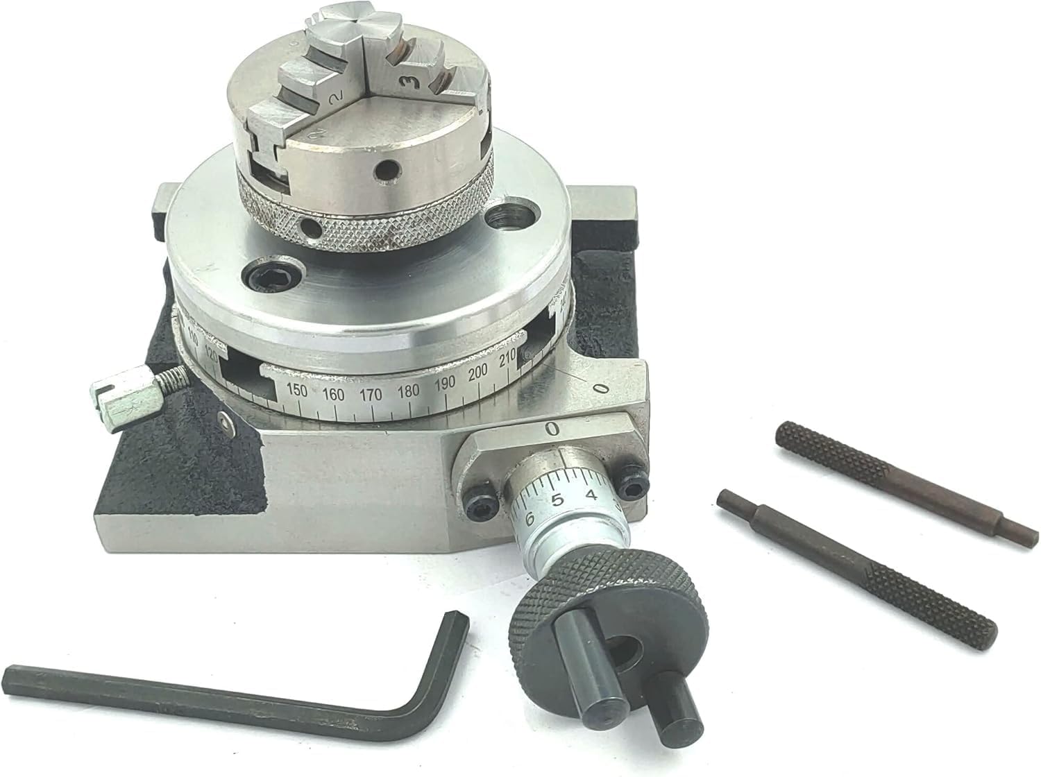 A rotary table is used to rotate a workpiece precisely during machining, allowing for accurate creation of circular features, angles, and indexing tasks. A chuck is used to securely hold and grip a workpiece on a machine tool, ensuring it remains stable and aligned during operations like turning, drilling, or milling. 3"/ 80 mm Rotary Table Small low profile Rotary Table for Milling operation with Table Diameter - 3 Inches (80 mm) Vertical Height - 1-5/8 Inch Gear Ratio - 36:1, which basically means that the 1 rotation of the handle shall rotate the table by 10 degrees. Base Dimensions: 4. 1/8" x 3. 1/4" 4 T-Slots: 5/16" Table scale is calibrated in 5 degree increement. Can be used both in horizontal & vertical position.