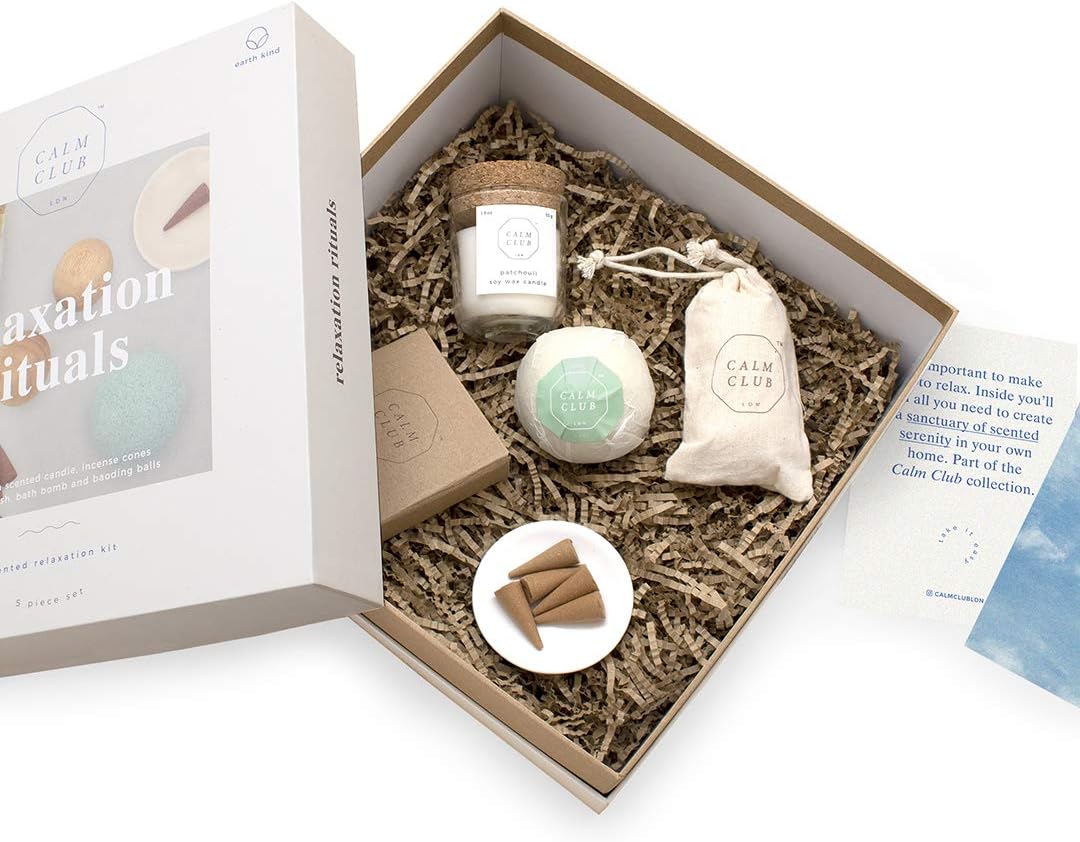 The Relaxation Rituals Gift Box from Calm Club is the perfect way to unwind. when the chaos of life gets too much, indulge yourself with this pamper hamper designed to help restore a sense of calm in your life. Our relaxation kit is supplied with a Patchouli scented soy Wax candle / 12 Sandalwood Incense cones & ceramic dish incense holder / Baoding Stress Balls with fabric case / Scented Bath Bomb / Meditation Card for Mindfulness. After a long day, fill the tub, throw in a scented bath bomb and light a relaxing scented candle - perfect candles gifts for women and an impressive bath bombs gift set. Instill a sense of calm in your home when you light the Sandalwood Incense Cones - drift away into Zen-like bliss and let the stresses of the day simply float away. When it comes to gifts for mum or gifts for him why not give hamper baskets for gifts that they will really love. Everyone can use a little help when it comes to relaxation! We've included everything you need to treat yourself to some much needed 'me time'. Materials include: Soy wax candle, bamboo, ceramic, cotton, cardboard, incense.